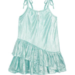 This girls' dress in a shimmering aqua hue features a metallic fabric that catches the light beautifully. Designed with adjustable tie straps and a ruched bodice detail, it offers a stylish fit. The asymmetrical ruffle hem adds playful movement, making it a fun and eye-catching piece for any day.