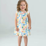 This girl's dress features a playful multicolor farm-inspired print. Designed with flutter sleeves, delicate ruffle trim along the hem, and a relaxed A-line silhouette, it?s lightweight, breathable, and perfect for sunny days.