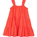 This girl's dress features a vibrant coral with a subtle textured check pattern. Designed with soft ruffled straps, and a tiered silhouette for effortless movement. The lightweight fabric ensures all-day comfort, making it a perfect pick for sunny days and special occasions.