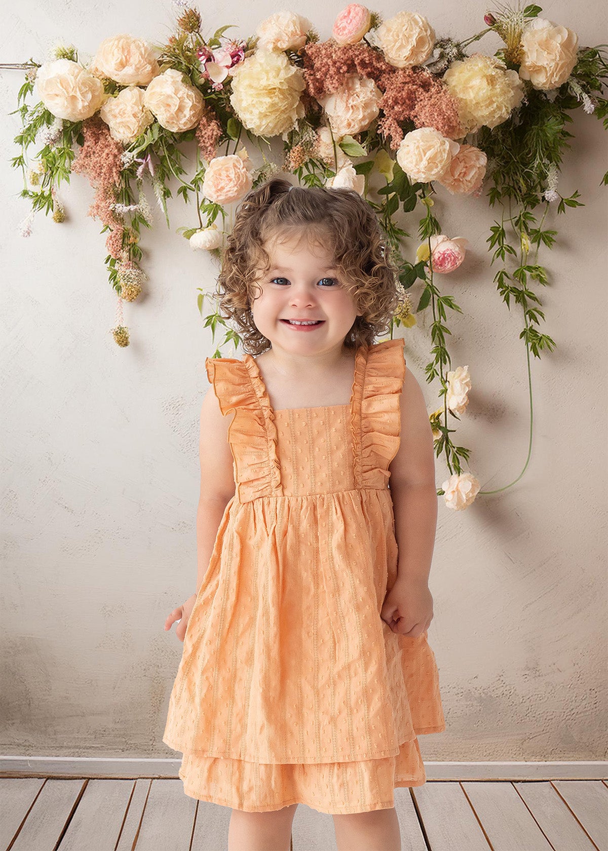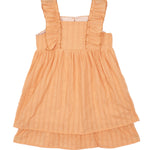 This girls' dress in a warm apricot hue features a lightweight woven fabric with delicate textured detailing. Ruffled shoulder straps add a playful touch, while the layered skirt creates a breezy, flowy silhouette. A back button closure ensures easy dressing, making this dress both stylish and comfortable for all-day wear.