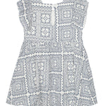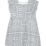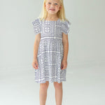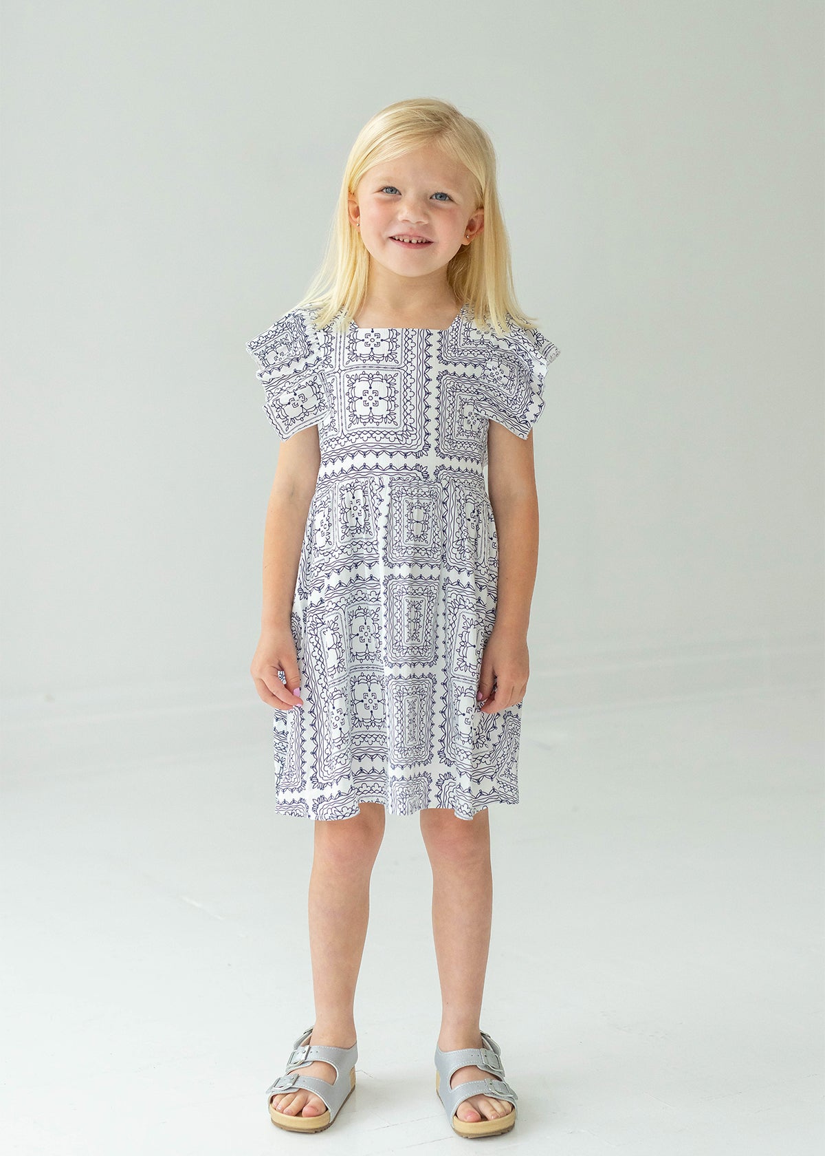 Lovely girl's dress showcasing a delicate blue and white patchwork pattern. Made from lightweight fabric, it features flutter sleeves and a gathered neckline for an added touch of grace. The A-line silhouette provides a comfortable fit, with a convenient back zipper closure for easy wear. Ideal for both special occasions and everyday adventures.
