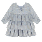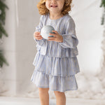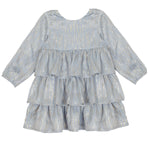 This girl's dress showcases a soft, light blue fabric adorned with delicate gold accents. The dress features tiered ruffles cascading down the skirt, adding playful volume and movement. Long sleeves with subtle gathering at the cuffs and a rounded neckline complete this charming design, perfect for adding a touch of elegance to any occasion.