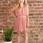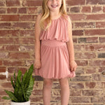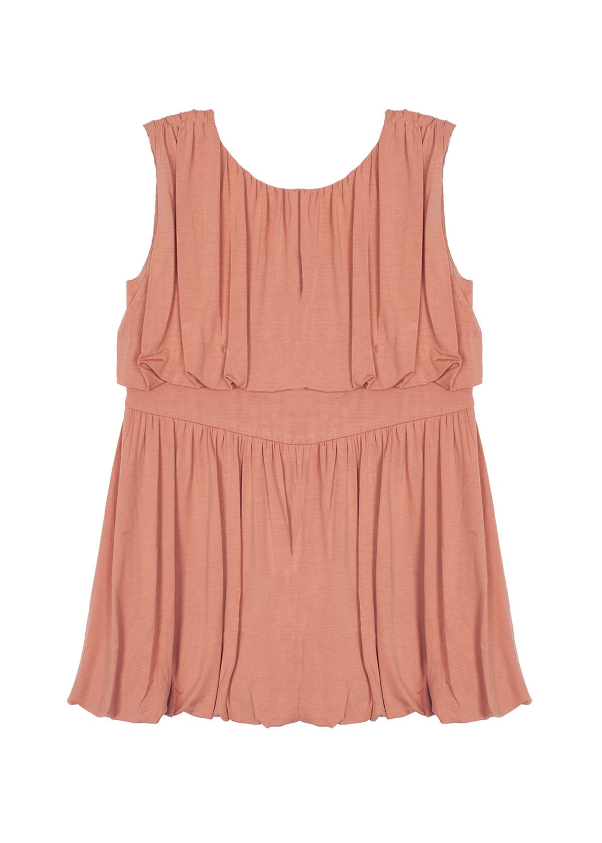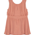 This soft dusty rose-colored dress features a relaxed, sleeveless design with elegant gathered detailing at the bodice for a breezy, effortless look. The wide waistband provides subtle definition, while the flowing skirt drapes beautifully for comfort and movement.
