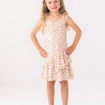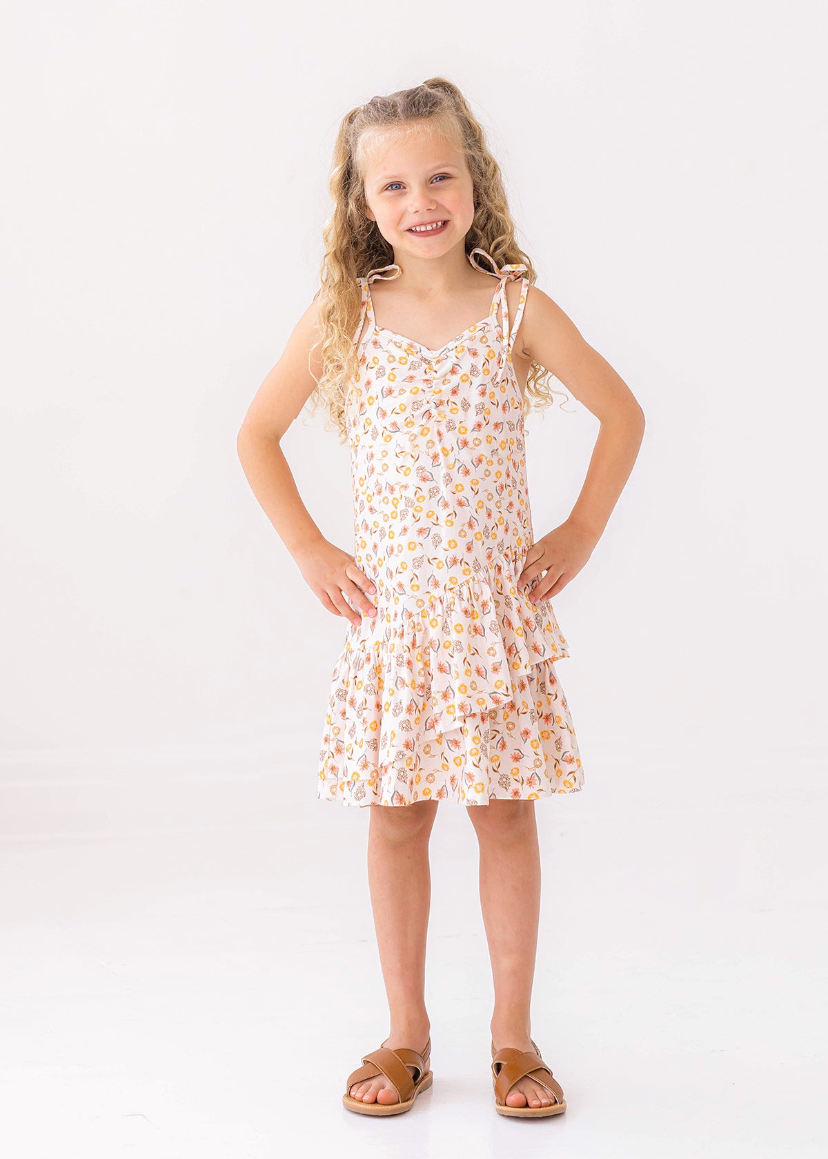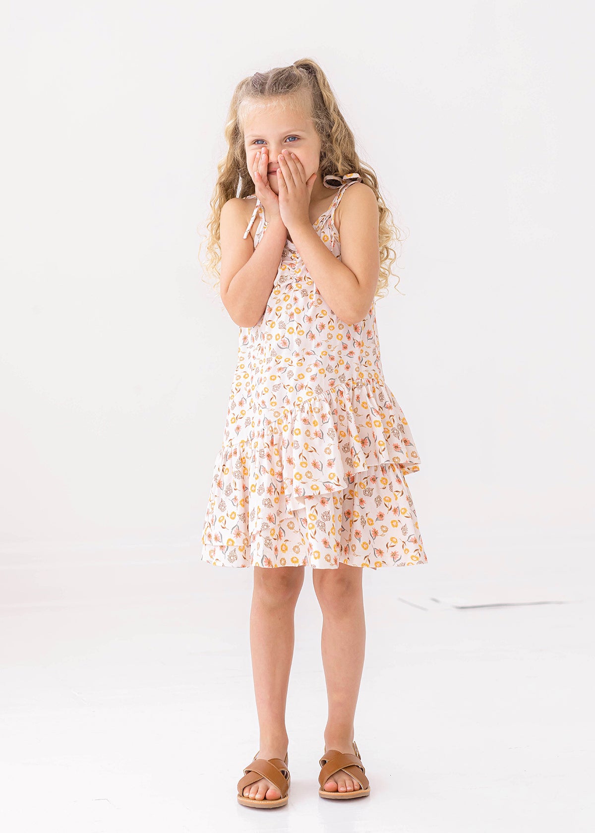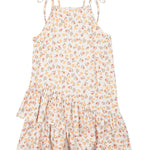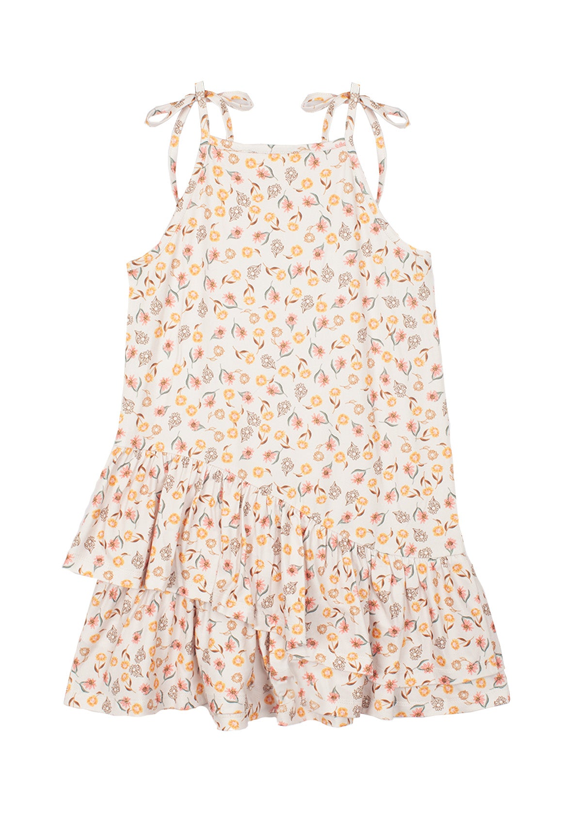 This girls' dress features an ivory base with warm peach and golden botanical accents. The halter neckline is adorned with fixed tie straps for a customizable fit, while the asymmetrical ruffle hem adds a playful touch. Crafted from lightweight fabric, this breezy silhouette ensures comfort and effortless movement.