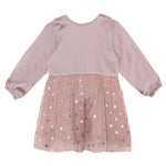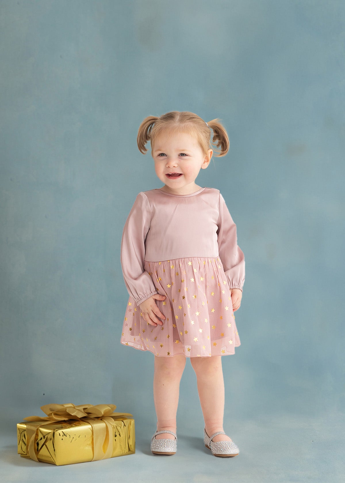 The In The Stars Dress is a pastel pink delight featuring long sleeves and a soft, round neckline perfect for little ones. Its sheer overlay skirt, adorned with shimmering gold stars, adds an enchanting touch, making it ideal for special occasions or dress-up moments. Designed to twirl effortlessly, this dress brings a playful elegance to your child's wardrobe.