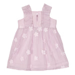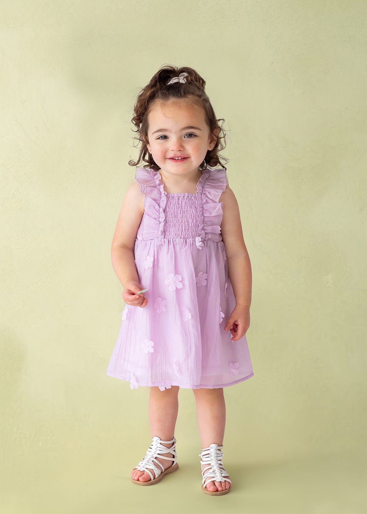 This girls' dress in soft lavender features a delicate sheer overlay with textured appliqu? details. Ruffled shoulder straps and a smocked bodice add a touch of elegance, while the lightweight fabric ensures a breezy feel. A keyhole button closure at the back completes this beautifully layered, airy silhouette.