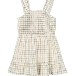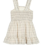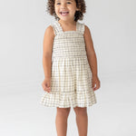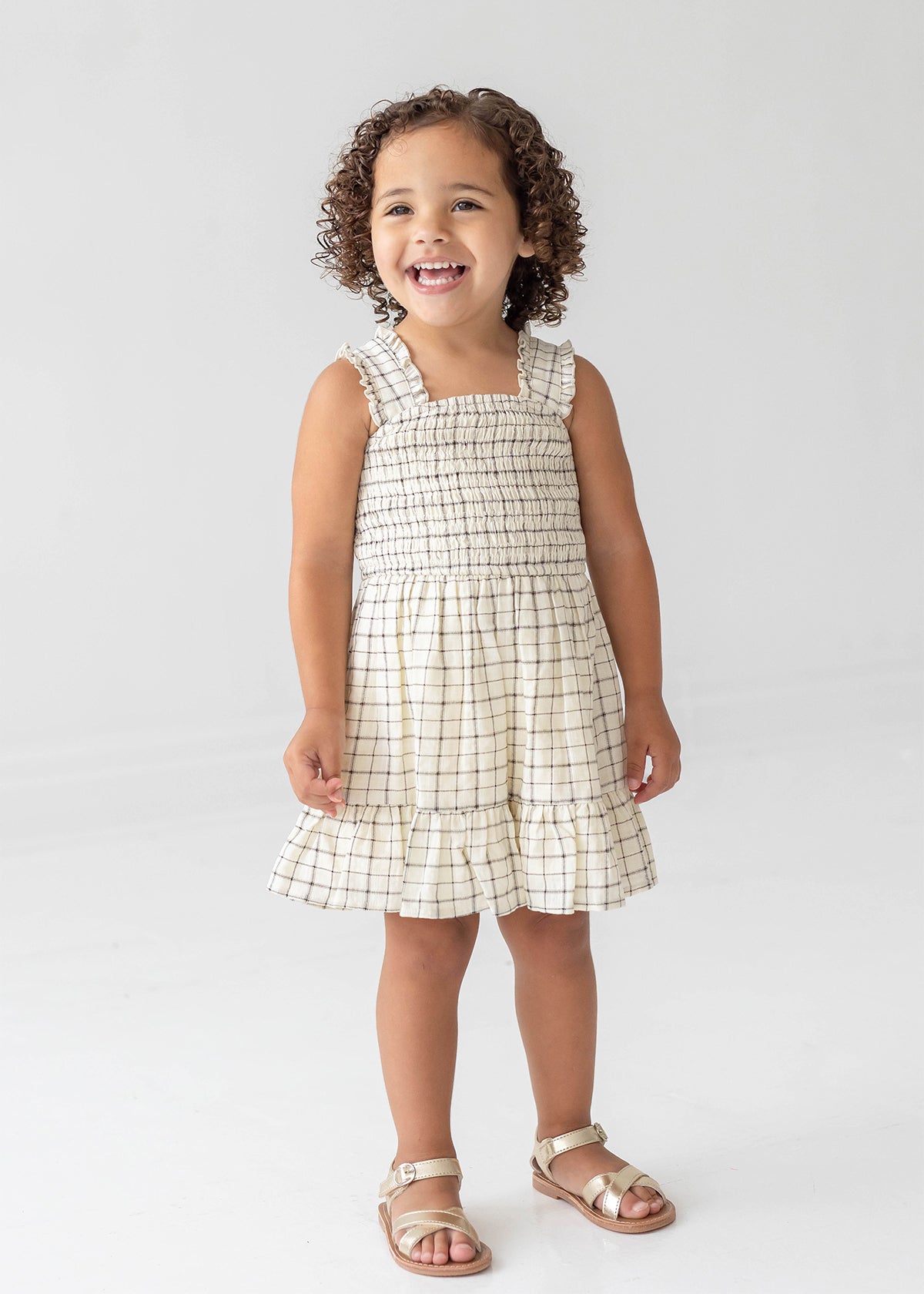 This dress features a soft, breathable fabric in a classic black and ivory plaid. The dress boasts a lined smocked bodice for a snug yet flexible fit, ruffle-trimmed shoulder straps, and a playful, tiered skirt.
