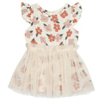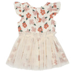 This girl's dress features soft, earthy-toned blooms. The top has flutter sleeves and a round neckline, while the skirt flows into layers of airy tulle for added volume. The blend of textures and muted colors creates an elegant look, perfect for any occasion.