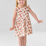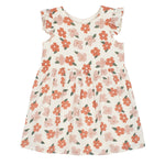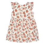 This girl's dress features warm coral-hued blossoms. Designed with flutter sleeves, a classic round neckline, and a gathered waist for a twirl-worthy skirt.
