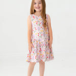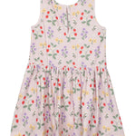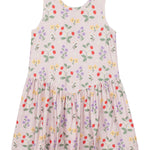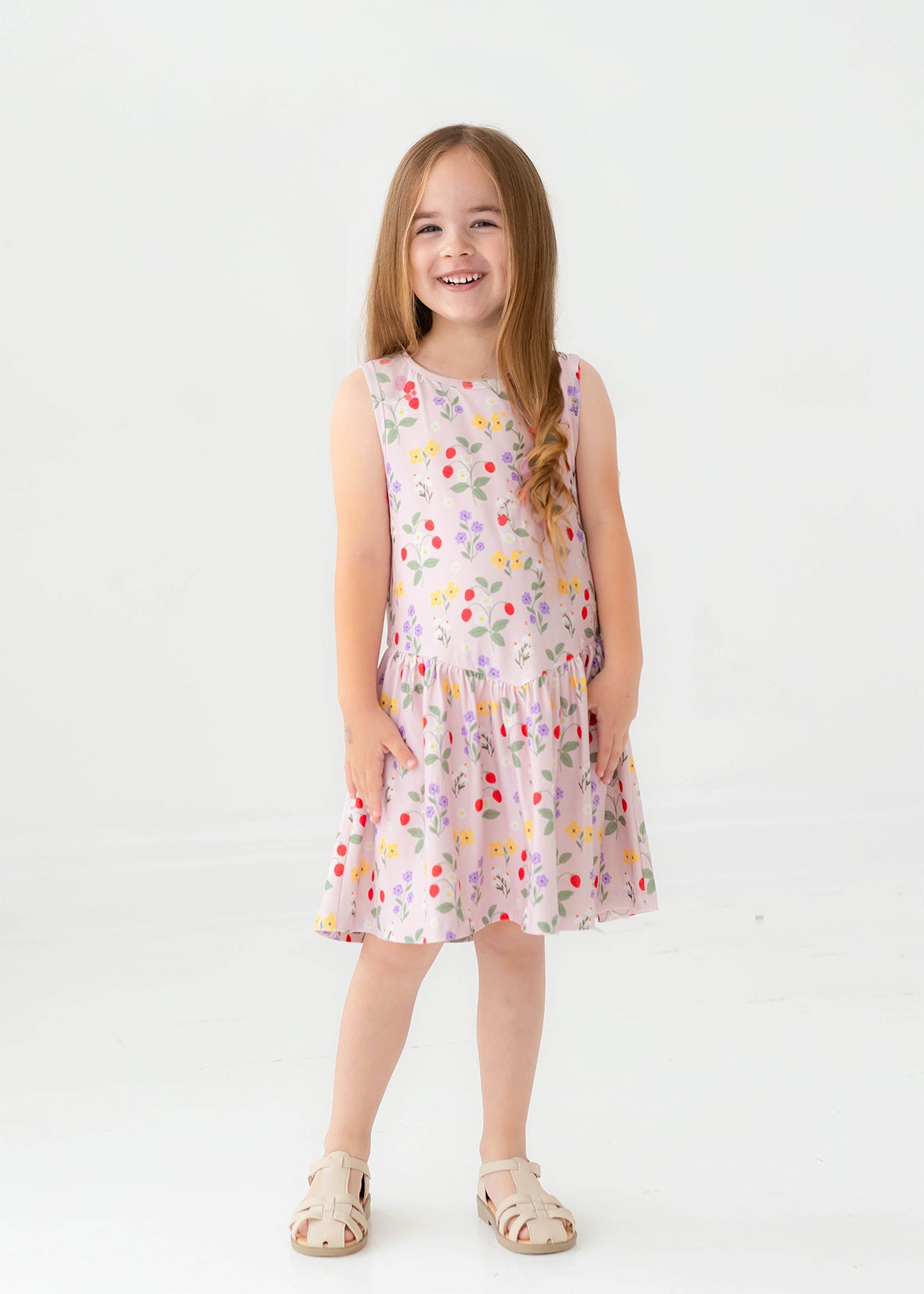 This charming girl's dress features a soft blush pink fabric adorned with a delightful floral print. The sleeveless design and gathered dropwaist create a playful, comfortable silhouette.