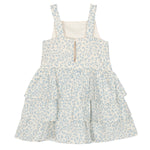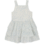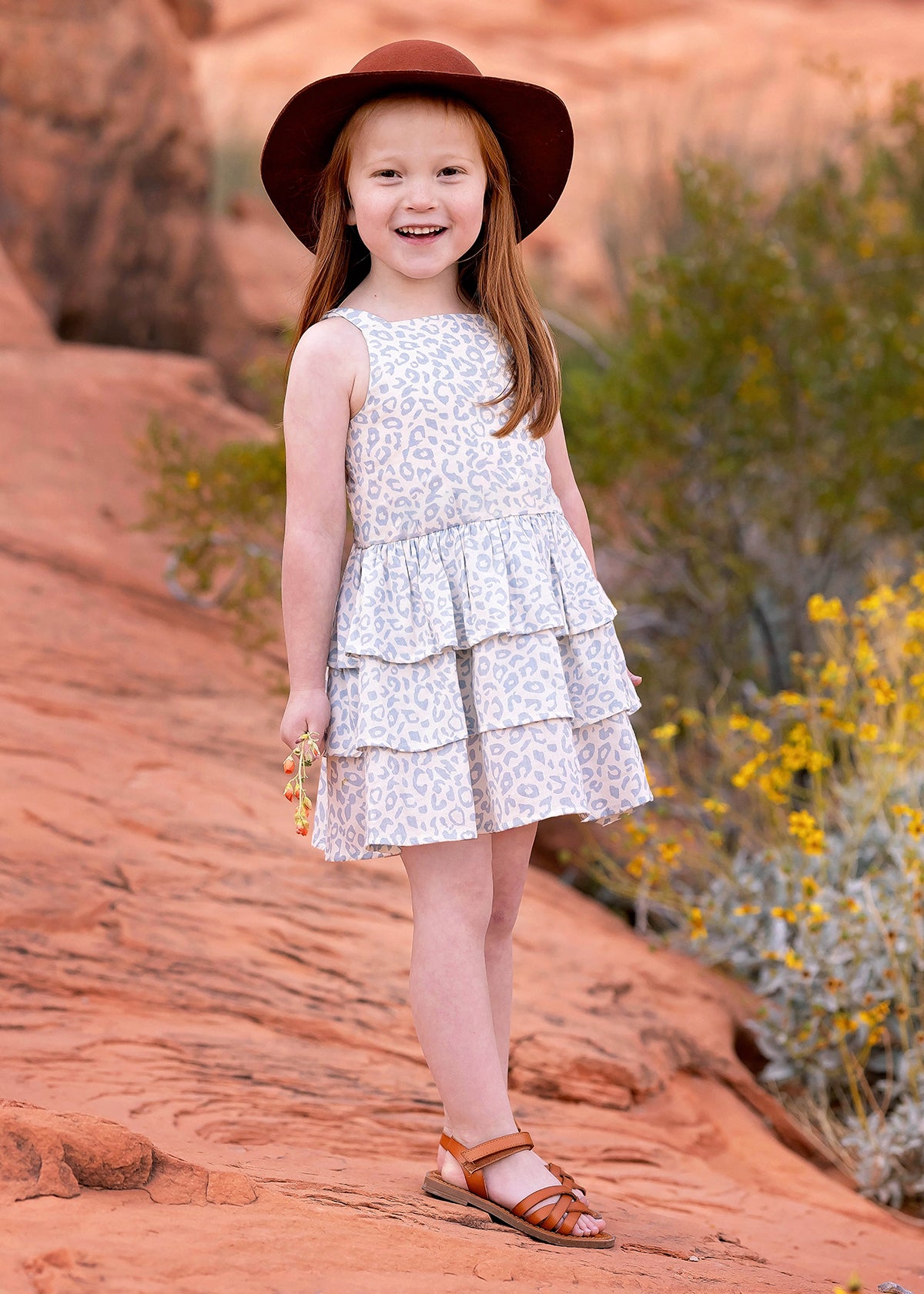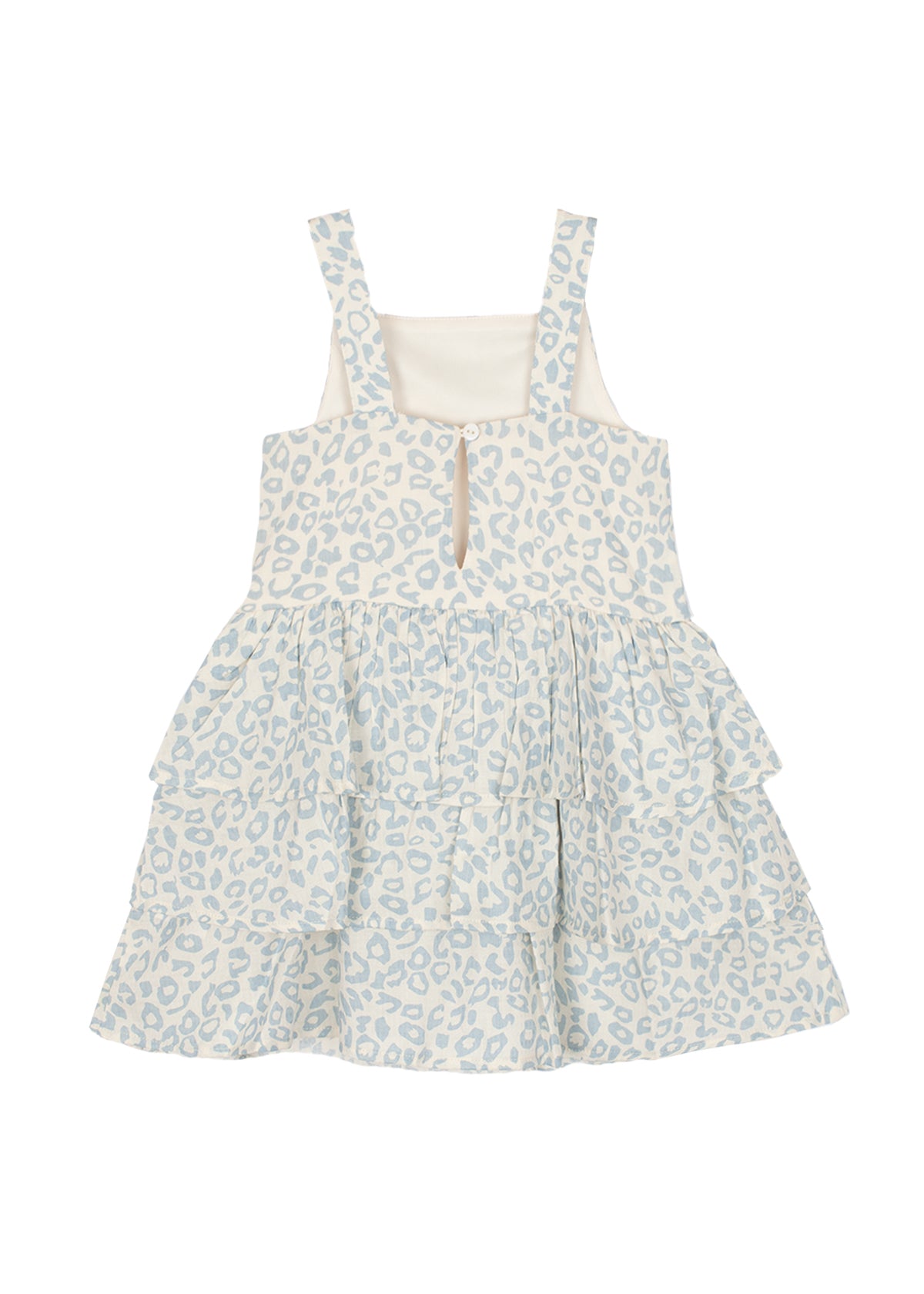 This girls' dress features a soft ivory base with a delicate blue leopard print for a stylish and playful touch. Designed with a square neckline and wide straps, it offers a comfortable fit. The tiered skirt adds volume and movement, making it a perfect choice for both casual outings and special occasions.