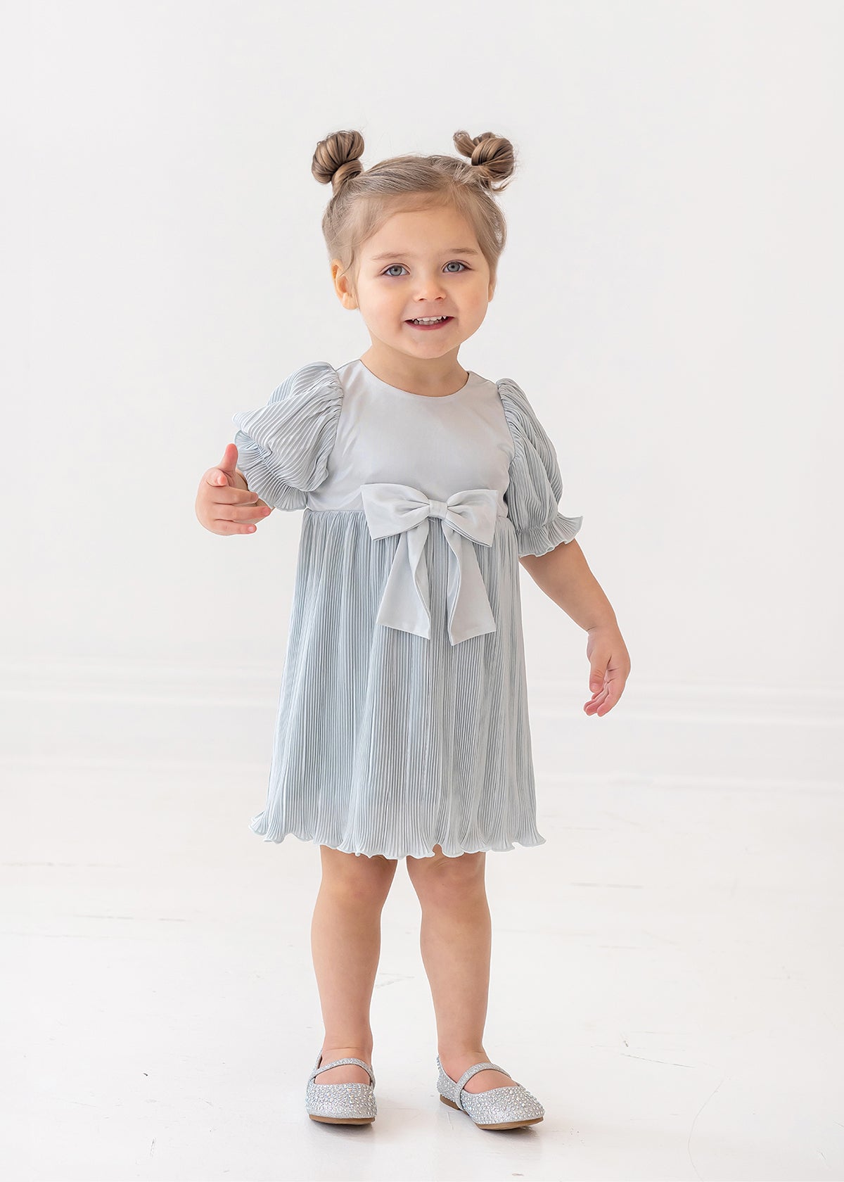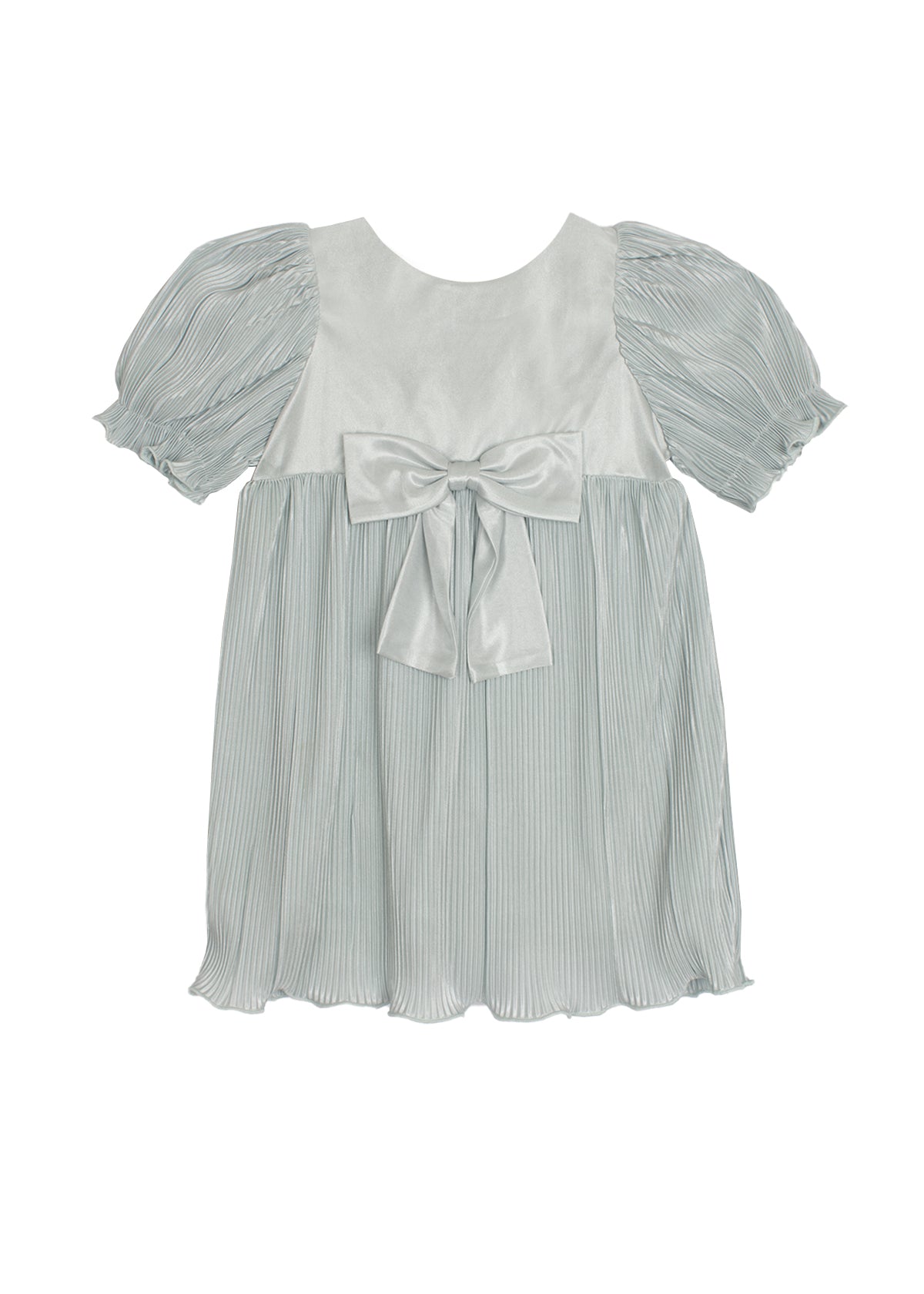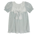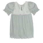 This girl's dress features an elegant design with soft, pleated fabric in a soothing light blue hue. The dress showcases puffed short sleeves and a delicate bow at the waist, adding a touch of charm. The lightweight material and flowing skirt create a graceful silhouette, perfect for special occasions or dress-up play.