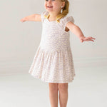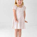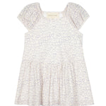 This girls' dress features a soft ivory base adorned with a delicate lavender heart print. Designed with puffed cap sleeves and a scoop neckline, it offers a sweet and timeless look. The tiered skirt adds a playful touch, while the lightweight fabric ensures comfort, making it perfect for everyday wear or special occasions.