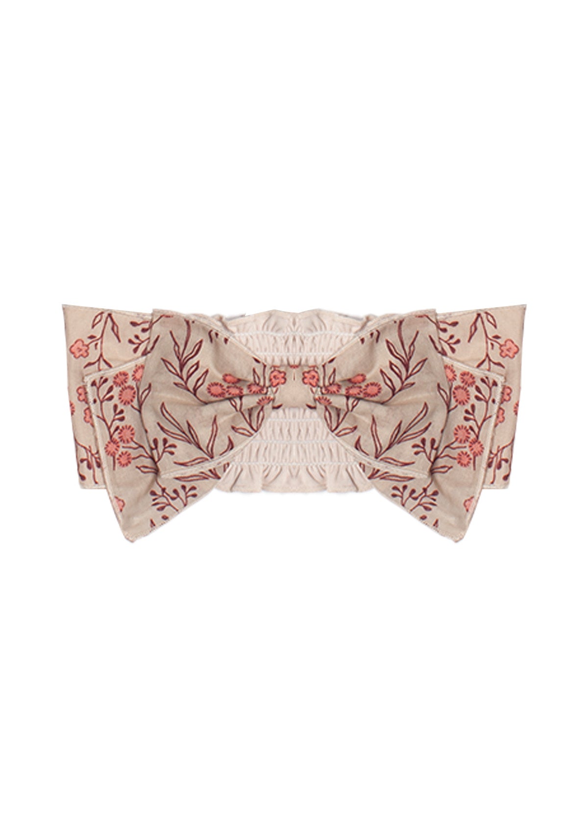 This beautiful hair accessory features an intricate floral embroidery in rich, warm tones on a light beige background. The bow adds a charming touch, making it an eye-catching piece for any outfit.