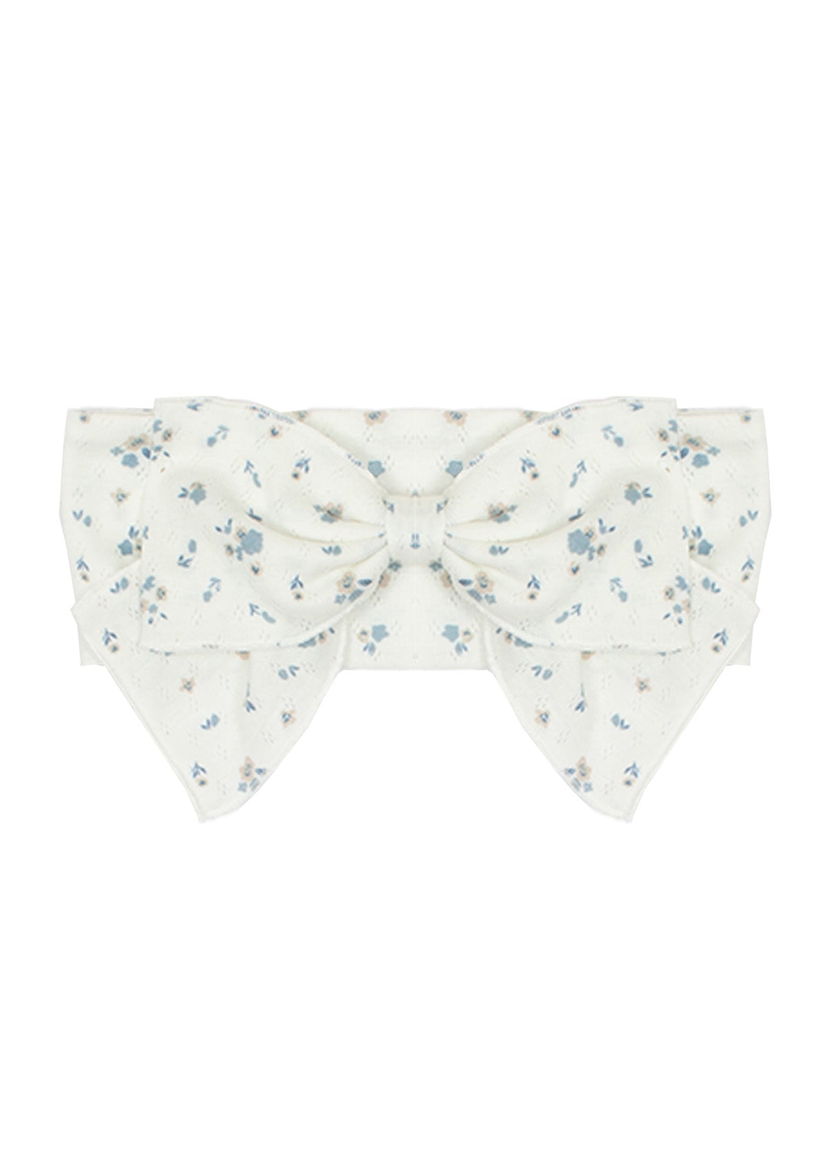 This hair accessory features a large bow adorned with a delicate blue floral print. The bow is set on an elastic band for a secure and comfortable fit.
