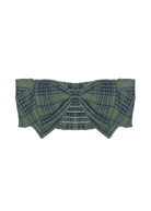 This stylish hair accessory features a classic plaid fabric in rich shades of forest green and navy blue. The bow adds a timeless charm to any ensemble. The elastic band ensures a secure and comfortable fit, making it a versatile piece for both casual and formal occasions
