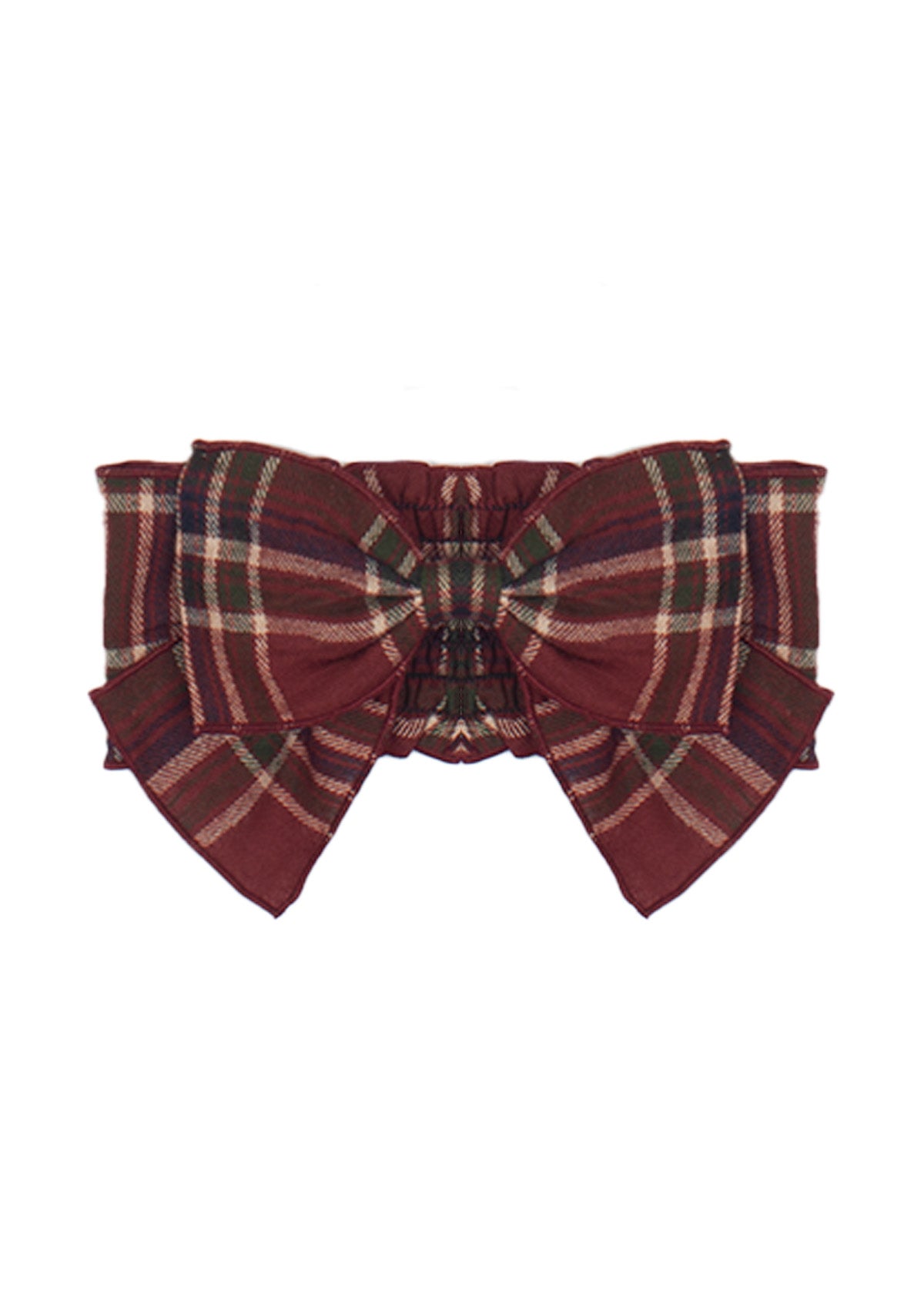 This elegant hair accessory showcases a classic plaid fabric in deep burgundy, navy, and cream tones. The large, meticulously crafted bow adds a touch of timeless sophistication to any outfit. With its elastic band, this accessory ensures a secure and comfortable fit, making it perfect for both casual wear and special occasions. Ideal for adding a stylish finish to your little one?s look.