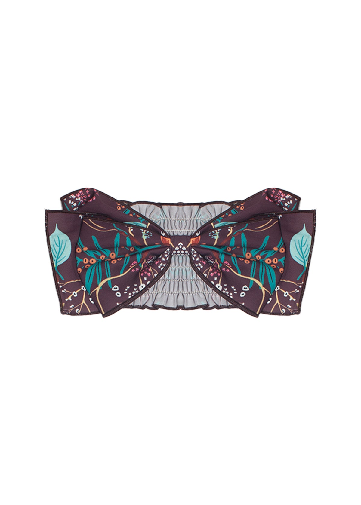 This elegant hair accessory features a rich, deep purple fabric adorned with a vibrant botanical print in shades of teal, pink, and gold. The large, intricately crafted bow adds a sophisticated and stylish touch to any outfit. The elastic band ensures a secure and comfortable fit, making it perfect for both special occasions and everyday wear. A beautiful accessory to elevate your little one's ensemble.