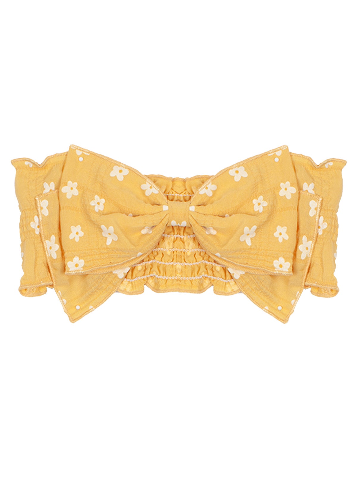 This baby girl headband in a warm golden hue features a delicate white daisy print for a playful touch. Designed with a structured oversized bow and a stretchy, smocked band, it provides a secure yet comfortable fit. Perfect for adding a sweet accent to any outfit, ideal for everyday wear or special occasions.