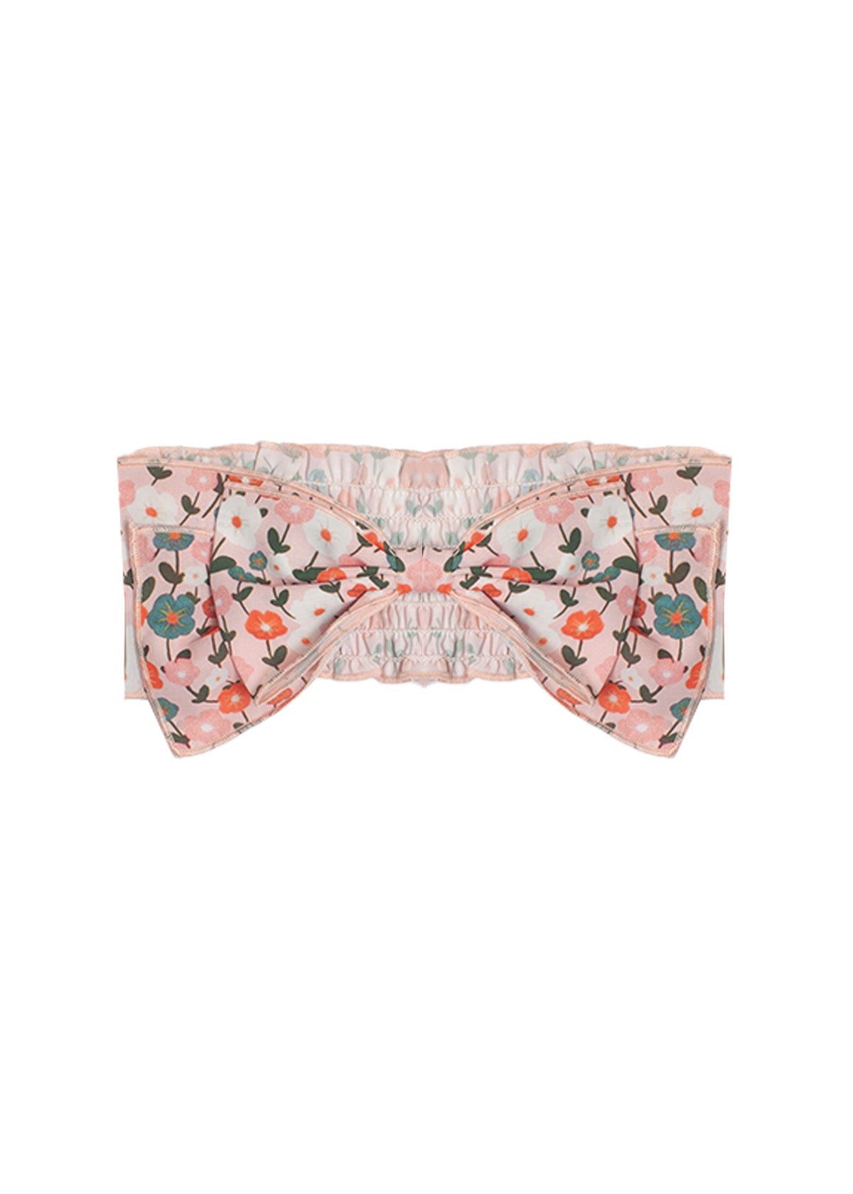 This piece features an enchanting floral pattern in soft pink tones, accented with vibrant pops of orange and blue flowers. It's designed with an elastic back for comfort and a large, decorative bow, making it perfect for stylish hair days.