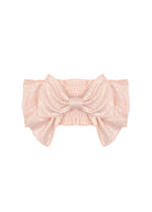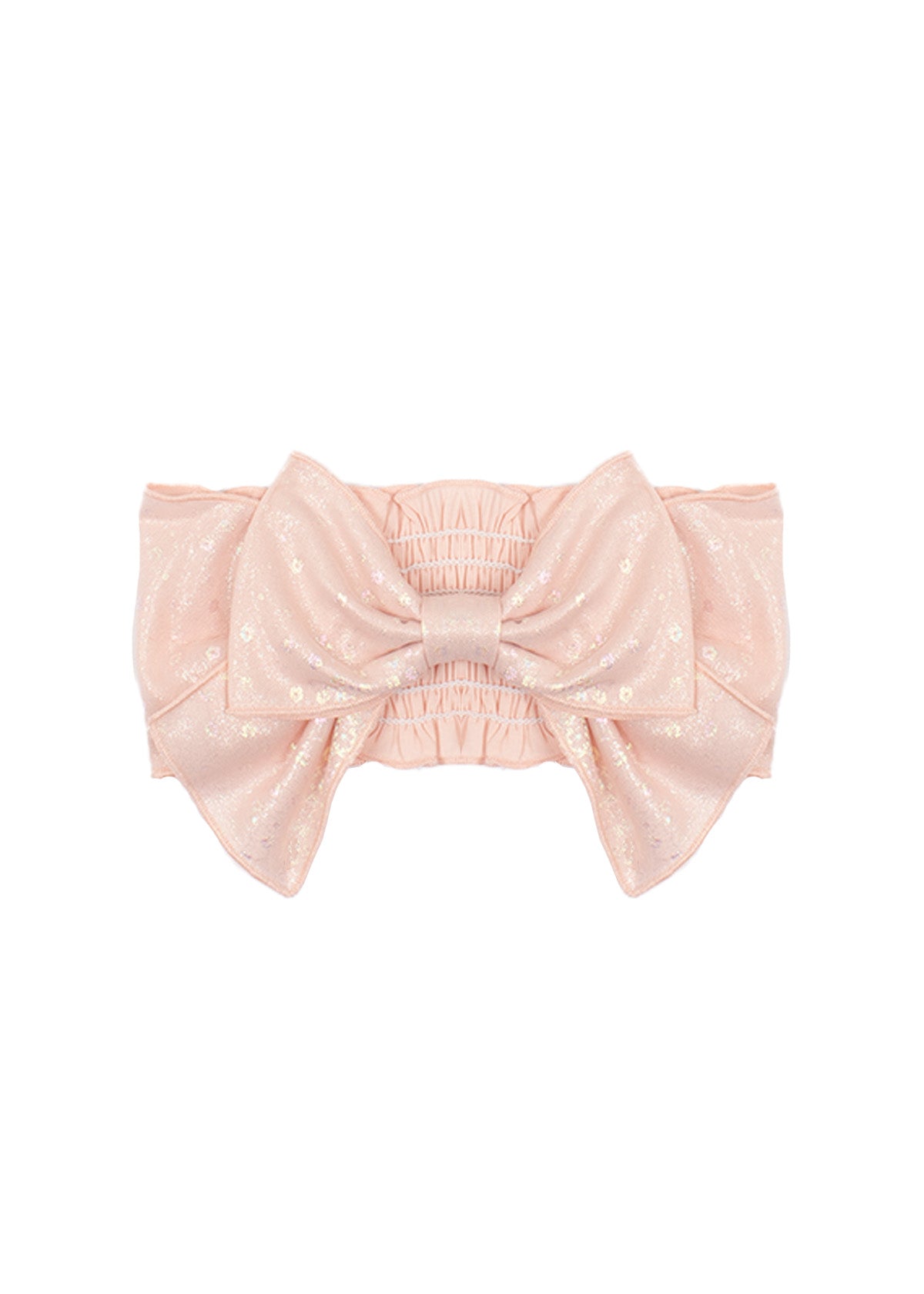 This elegant hair accessory features a soft pink hue with delicate iridescent floral details on a breathable fabric. The large, beautifully crafted bow adds a touch of sophistication to any outfit.