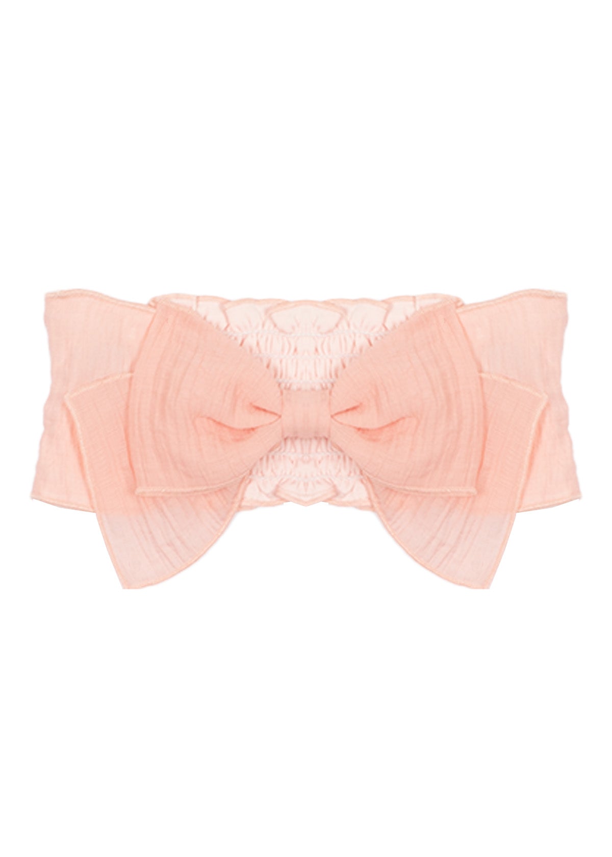 This elegant girl's hair accessory features a large bow in a warm, dusty rose hue. Crafted with a delicate texture, the bow is set on an elasticized band for a secure and comfortable fit.