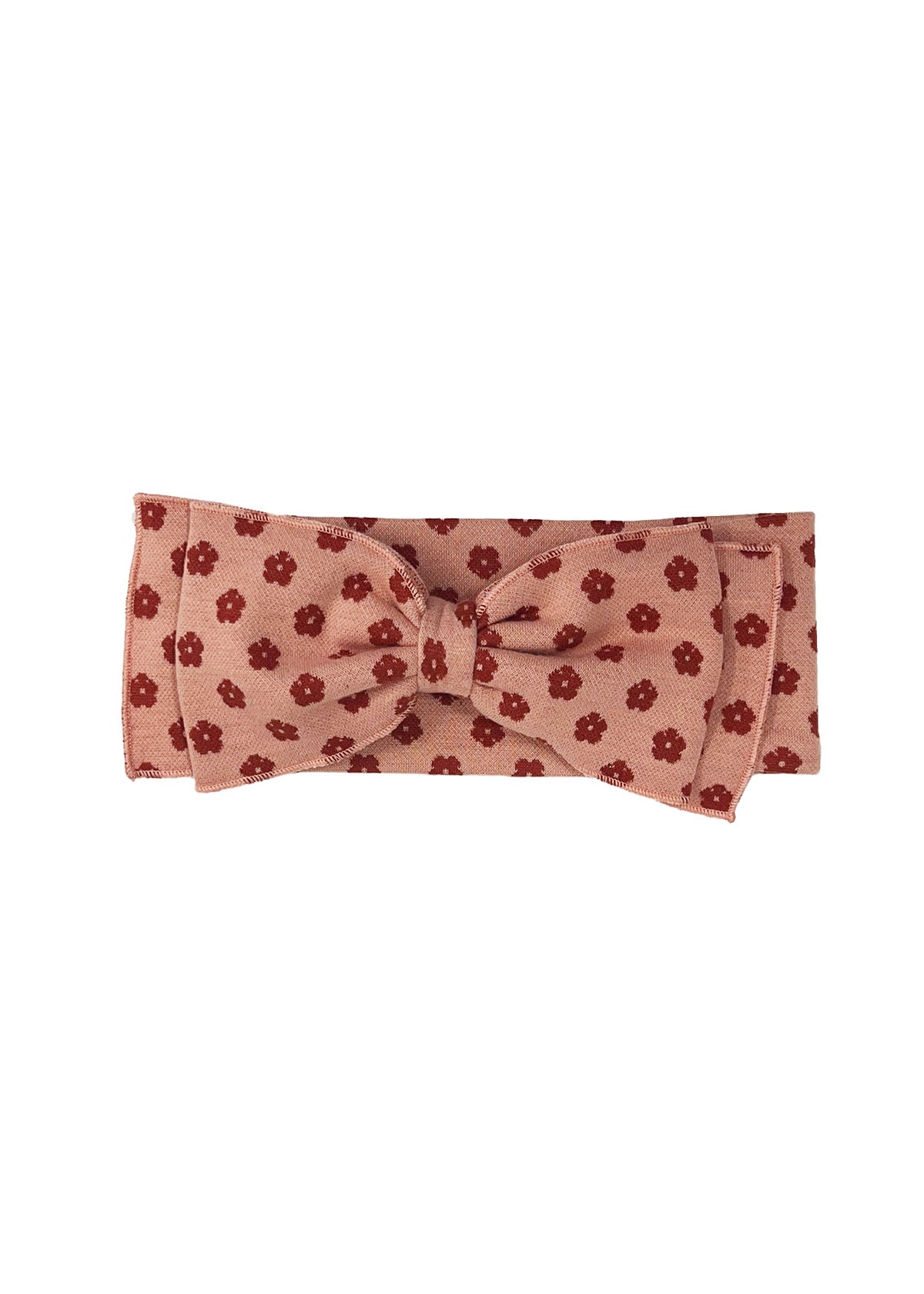 This adorable girl's hair accessory features a soft, ribbed fabric in a warm blush hue, adorned with charming red floral prints.