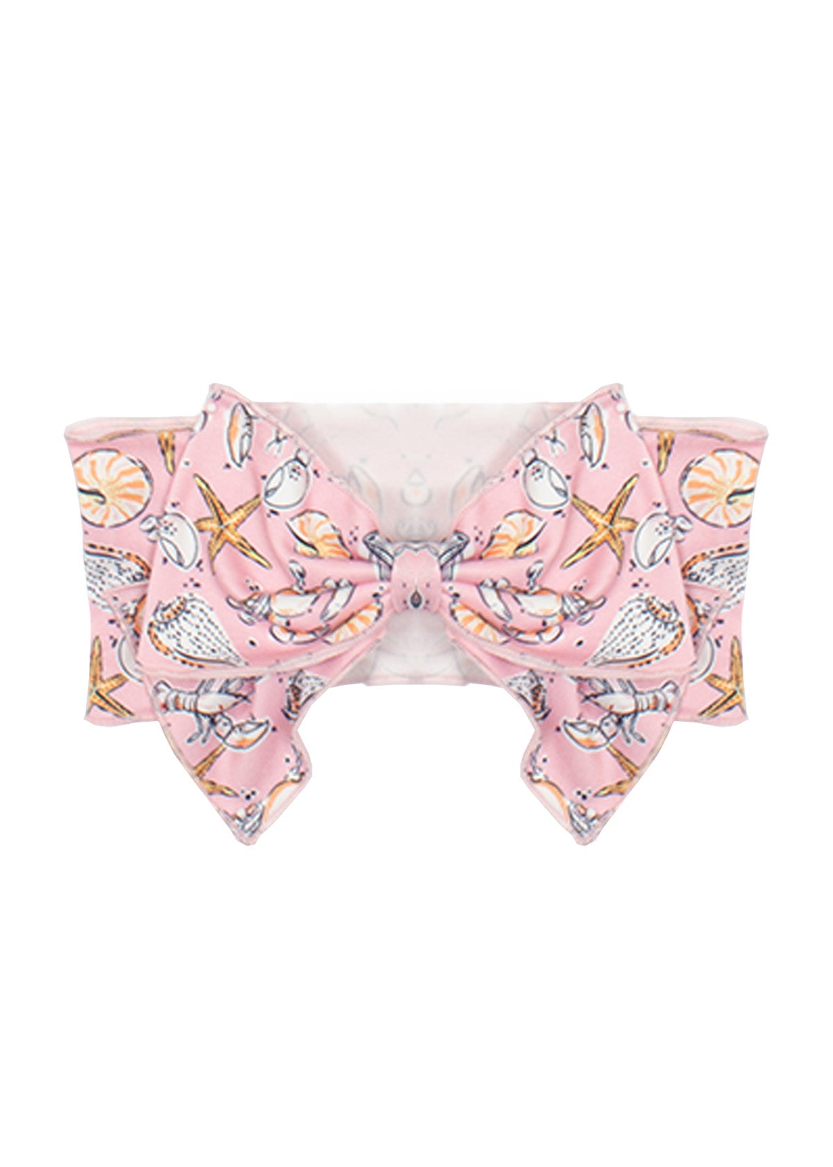 This baby girl headband features a soft, stretchy fabric in a delicate pink hue with a playful seashell and starfish print. The oversized bow adds a stylish touch, while the comfortable fit ensures all-day wearability. A perfect accessory to complete any little one's outfit with a fun, coastal-inspired look.