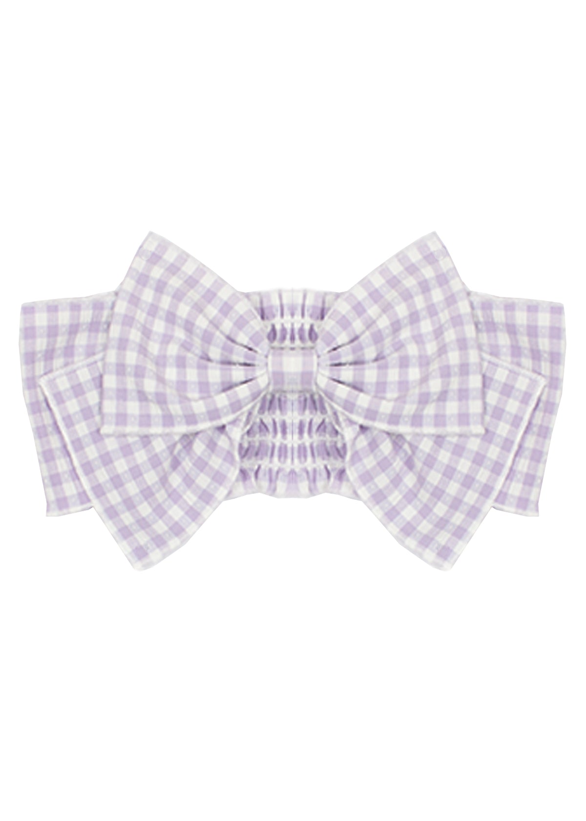 This charming hair accessory features a classic lavender and white gingham pattern on a soft, breathable fabric. The large, meticulously crafted bow adds a delightful touch to any outfit.