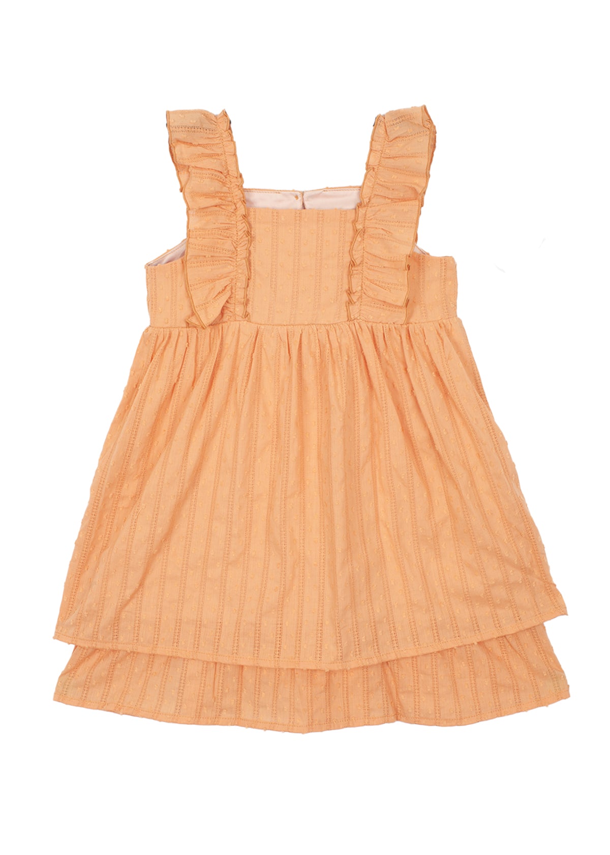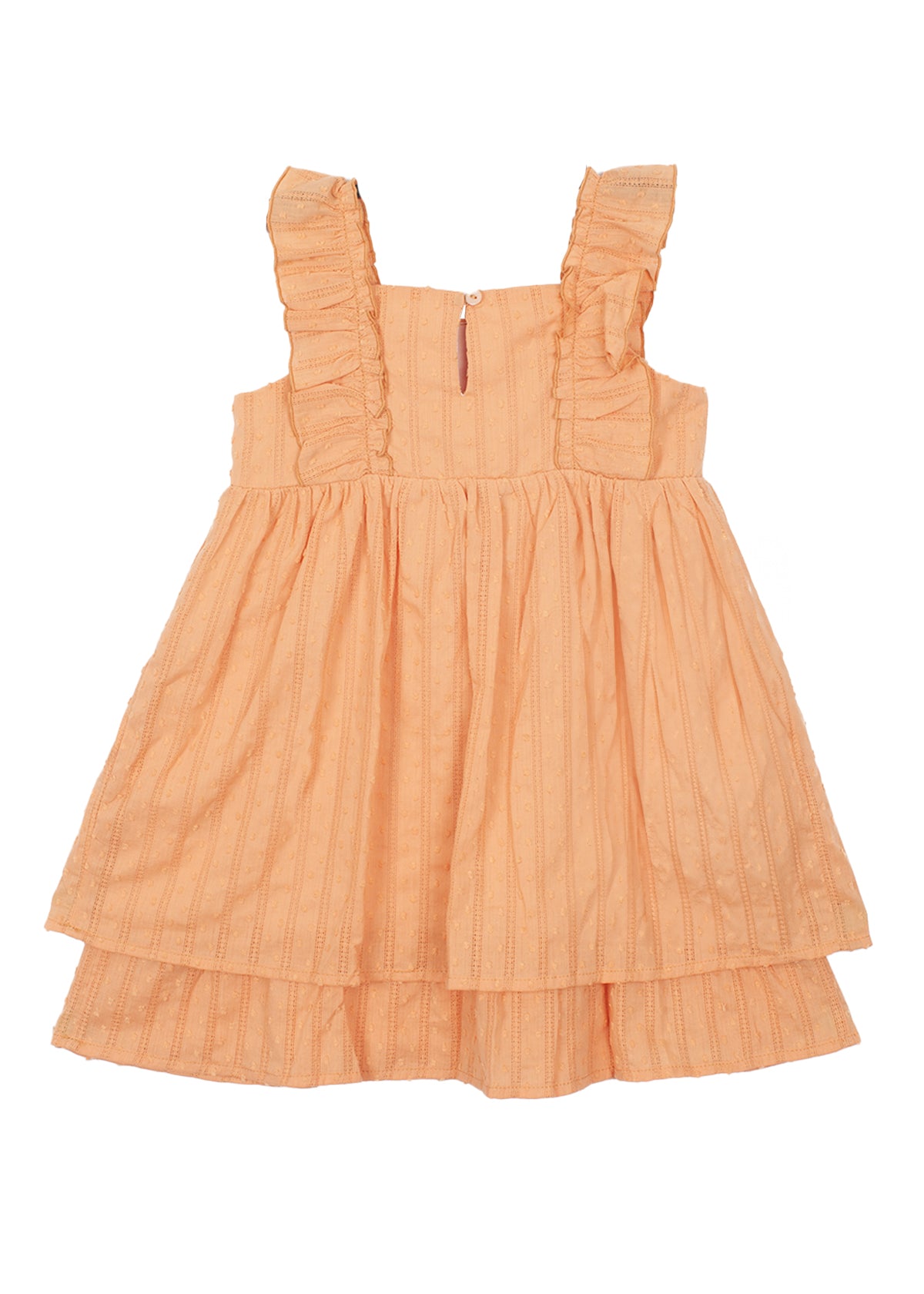 This girls' dress in a warm apricot hue features a lightweight woven fabric with delicate textured detailing. Ruffled shoulder straps add a playful touch, while the layered skirt creates a breezy, flowy silhouette. A back button closure ensures easy dressing, making this dress both stylish and comfortable for all-day wear.