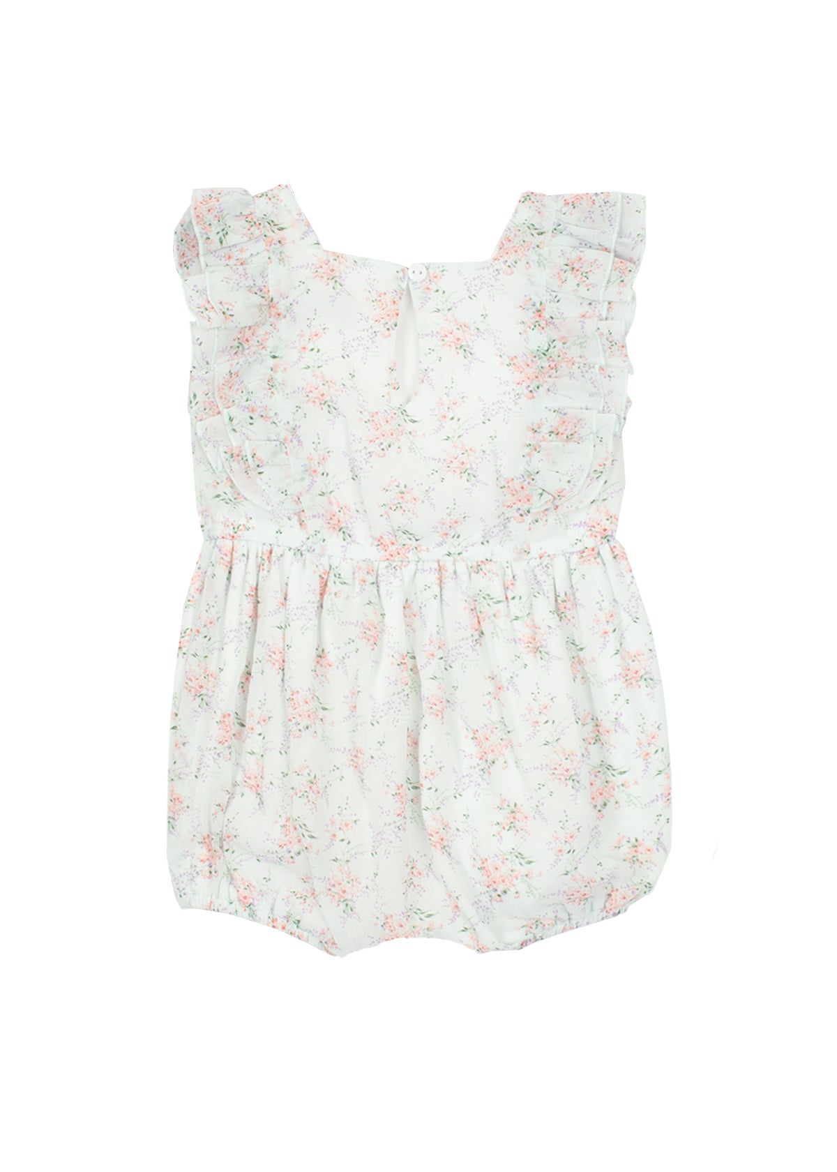 This baby girl romper features a botanical print in soft pastel with shades of pink and blue. The romper is designed with sweet ruffled details in a bubble silhouette.