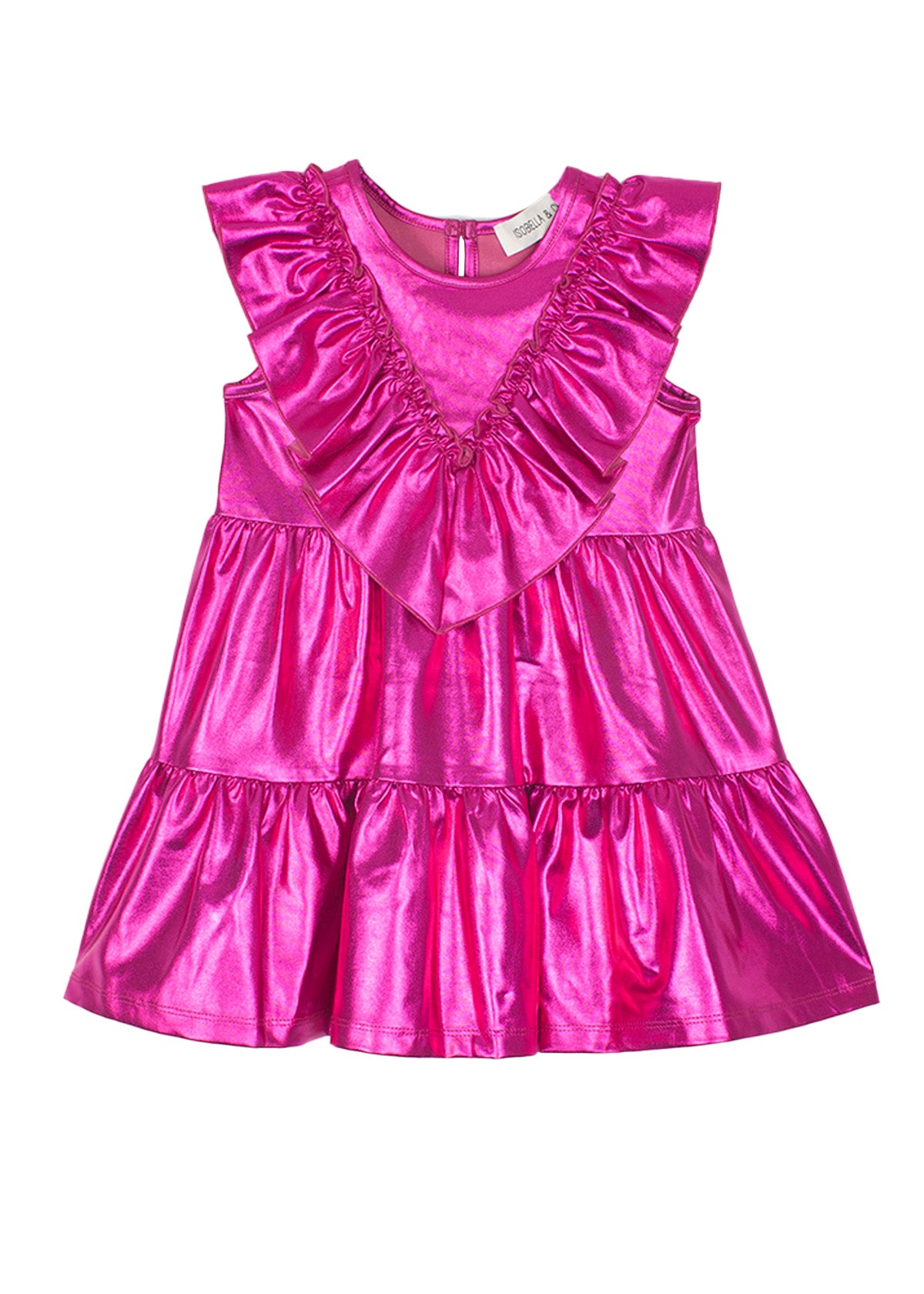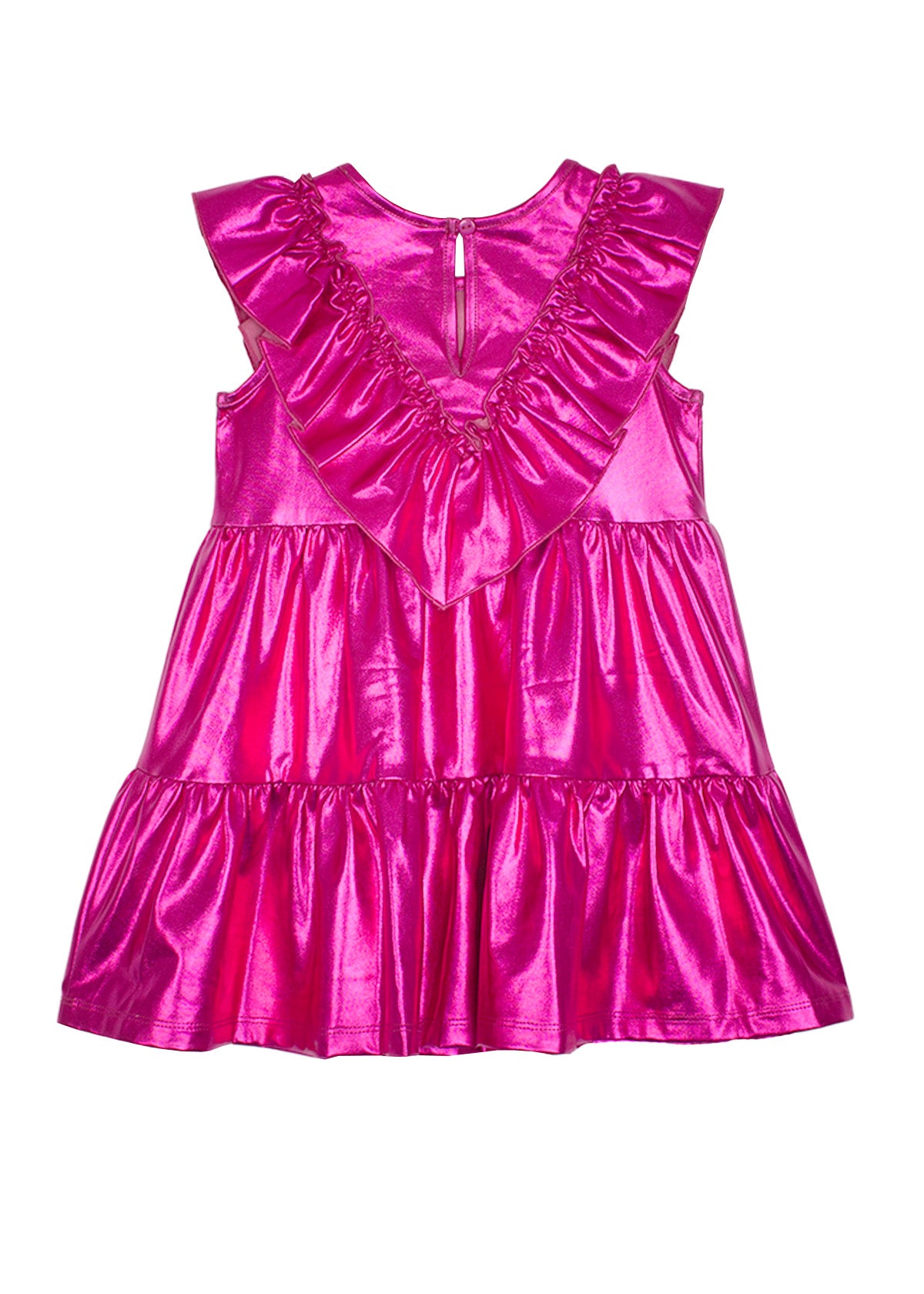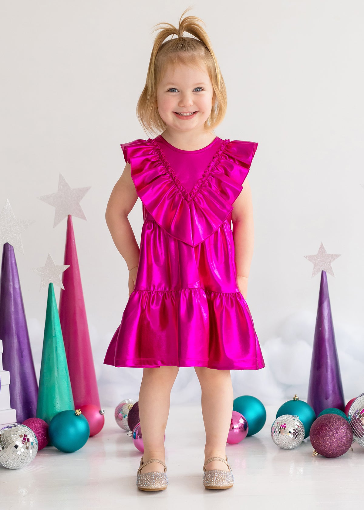 This vibrant girl's dress is crafted from a shiny, metallic fabric in a striking fuchsia color. It features a ruffled V-neckline and layered skirt for added volume and flair. The sleeveless design and soft, lightweight material make it perfect for parties and special events, adding a touch of bold elegance to any occasion.