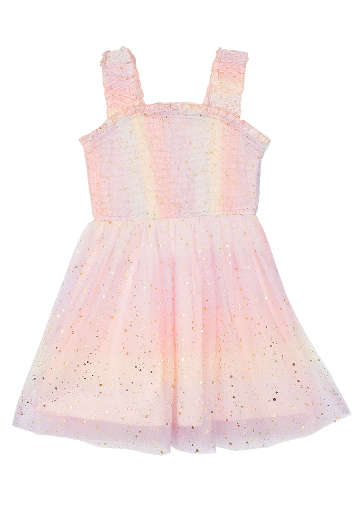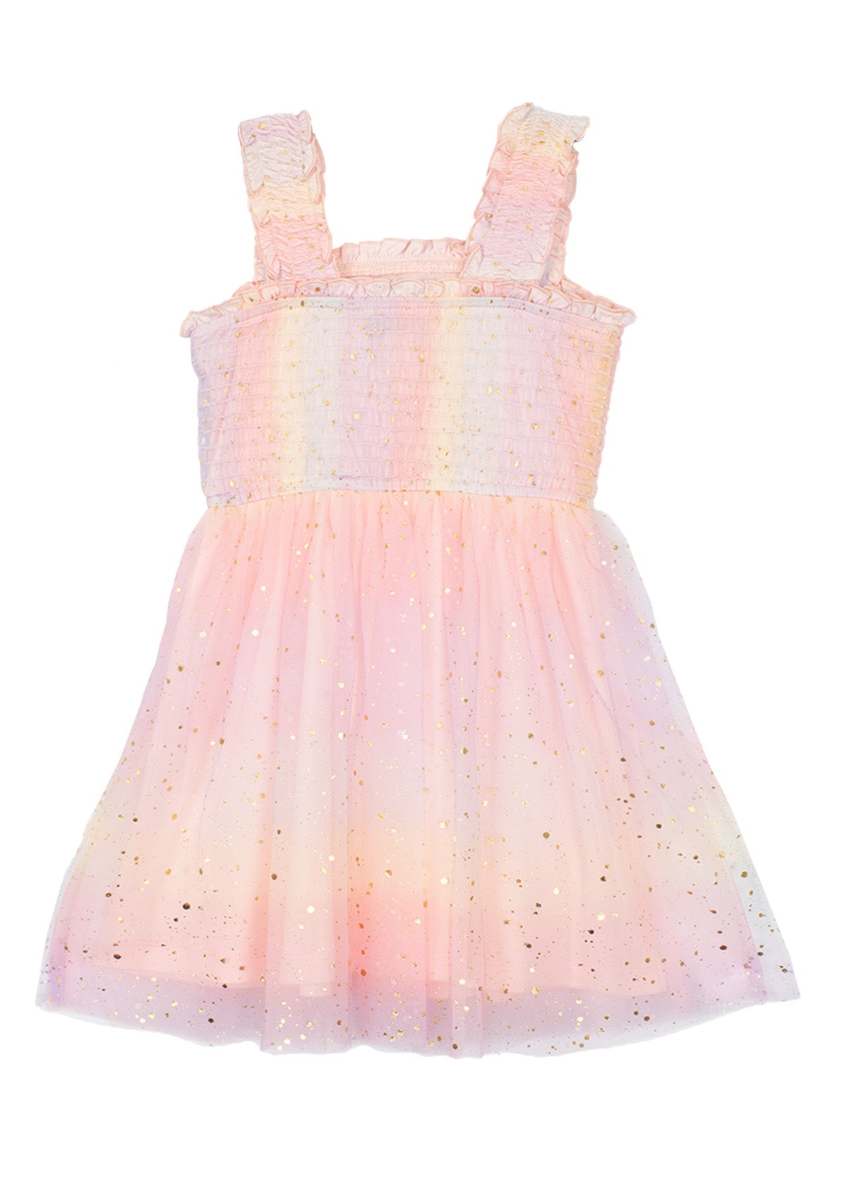 This magical girl's dress features a dreamy ombre of pastel pinks, yellows, and purples, adorned with glittery star accents.The flowy tulle skirt offers a lightweight, twirl-worthy silhouette, perfect for special occasions and celebrations.