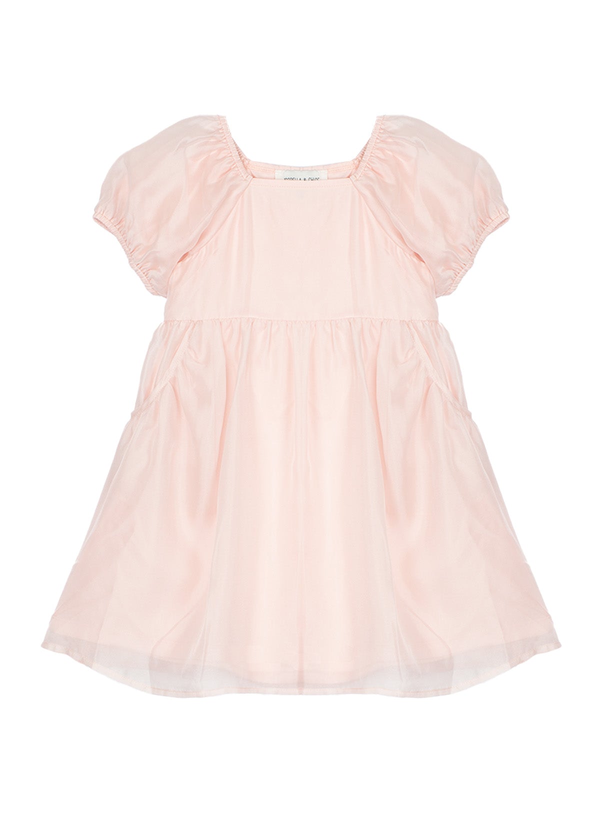This enchanting girl's dress features a delicate, airy fabric in a soft pink hue. The puff sleeves and gathered waist create a charming silhouette, perfect for special occasions. The lightweight material adds a touch of elegance, while the flowing design ensures comfort.