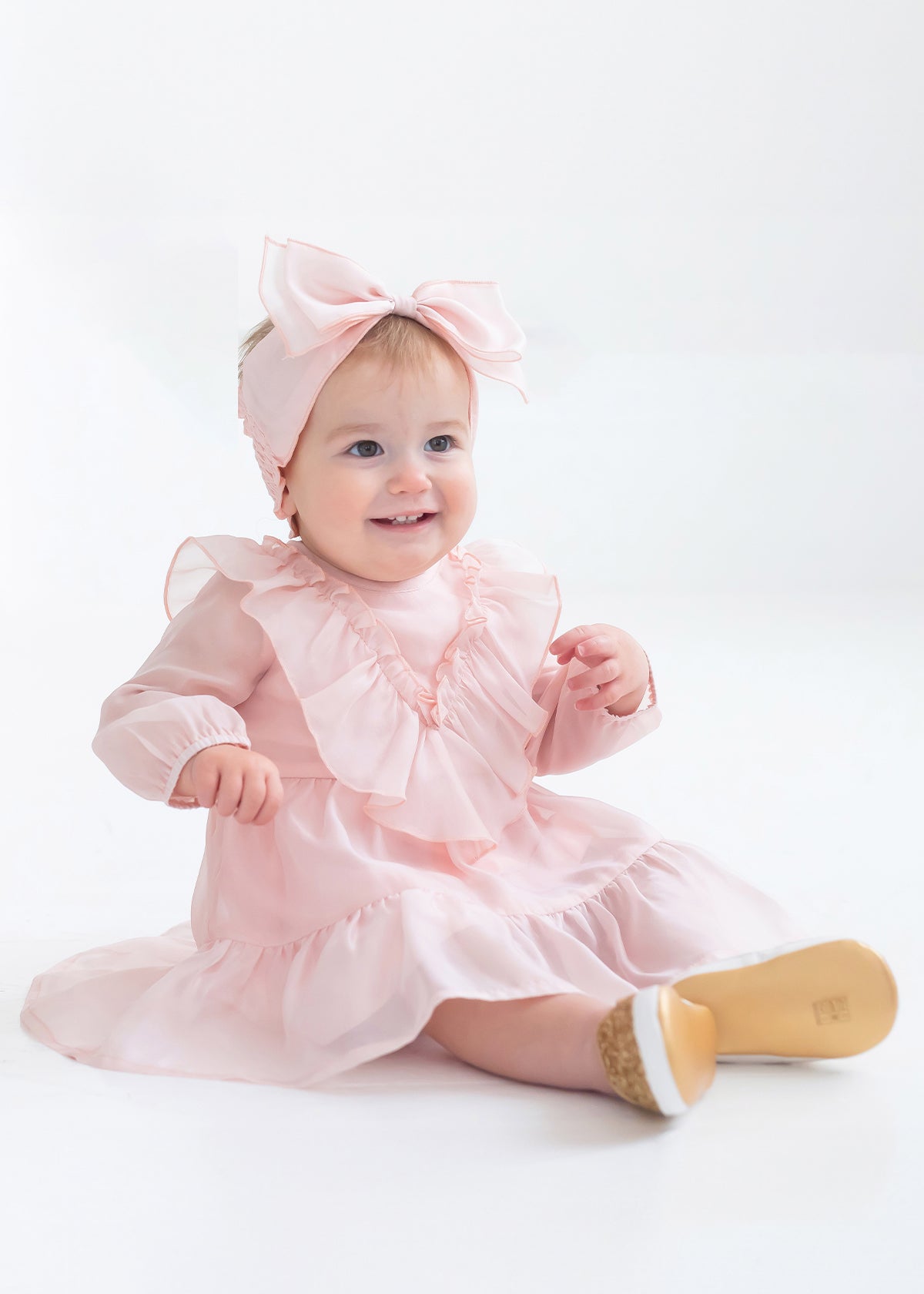 This charming girl's dress in a soft pink hue features a lightweight, airy fabric that drapes beautifully. The dress is adorned with cascading ruffles along the front and hem, adding a touch of playful elegance.