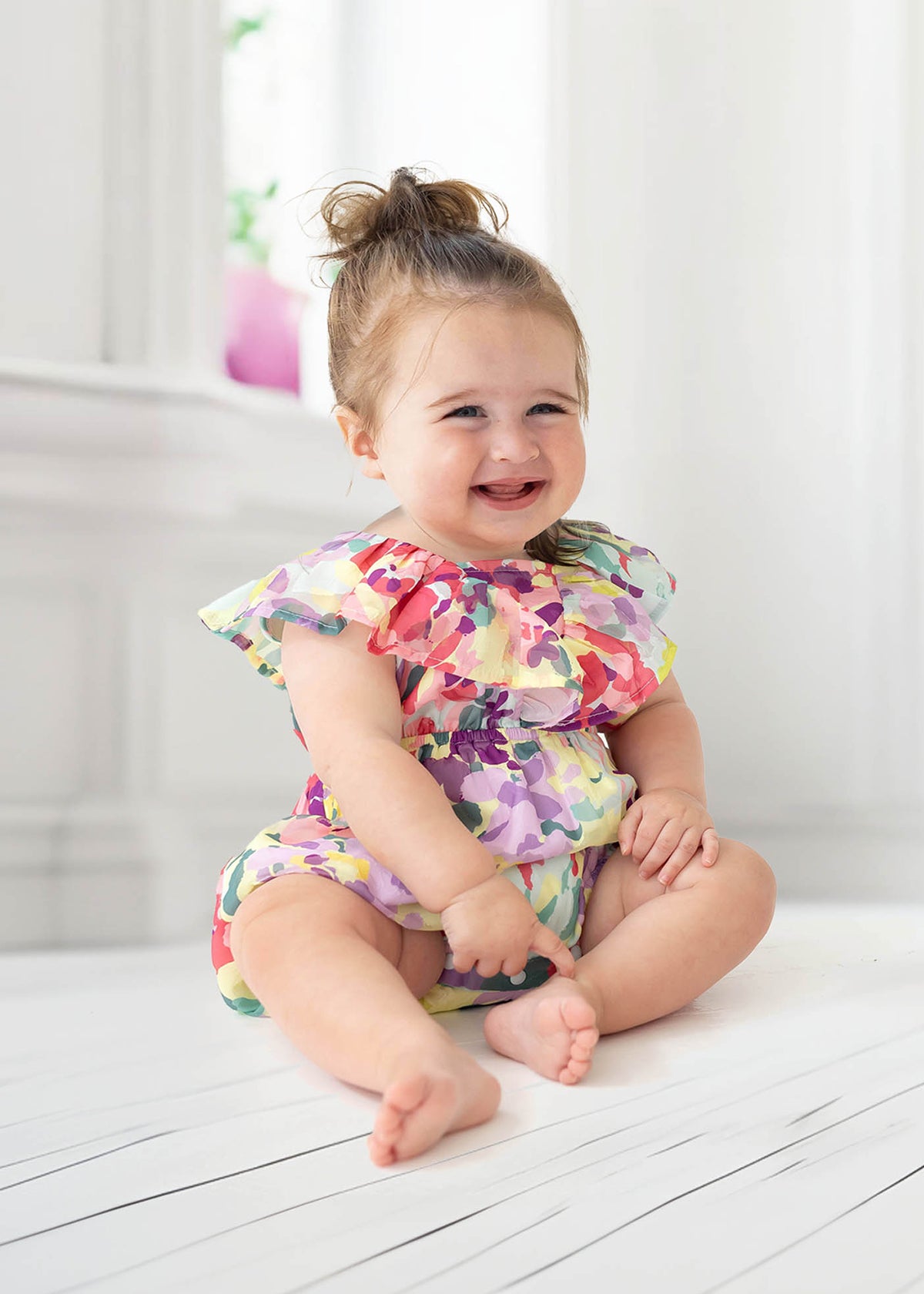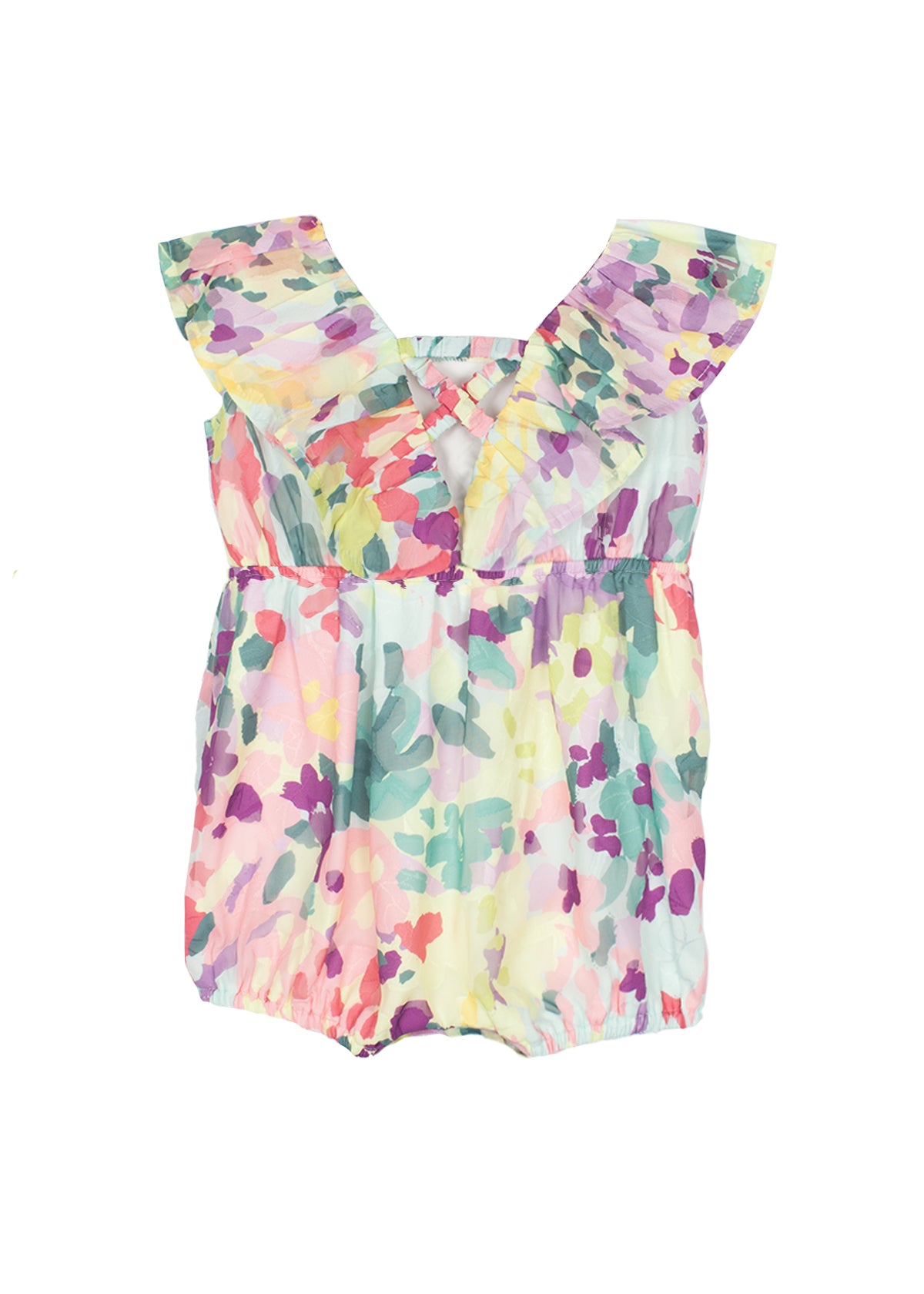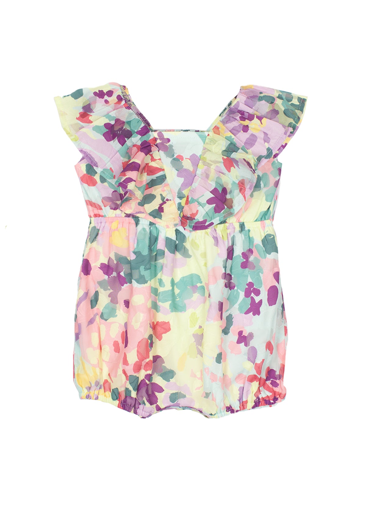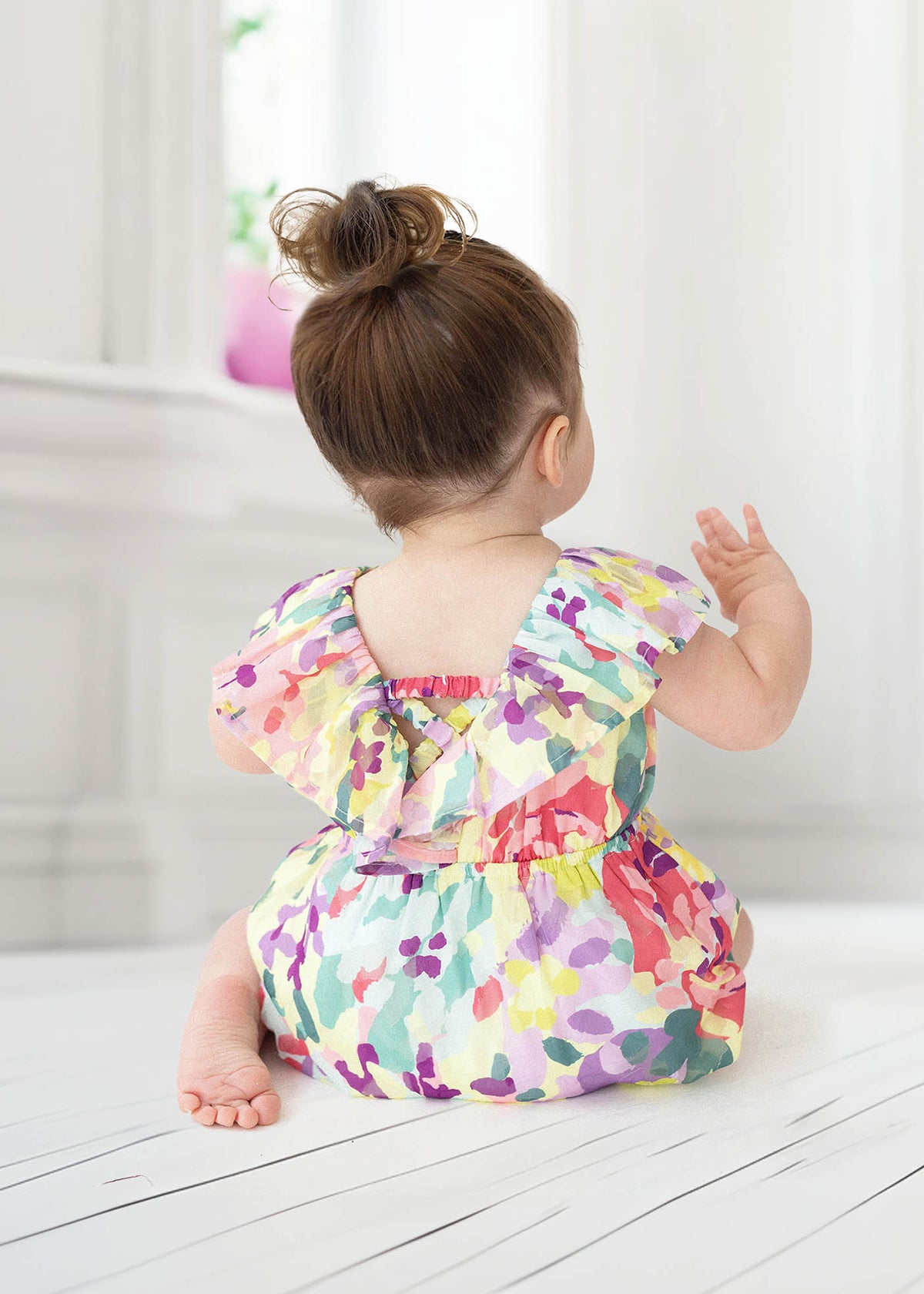 This baby romper features a vibrant multicolor floral print on chiffon fabric. Designed with ruffled flutter sleeves and a V-neck back detail, it combines style and comfort. The elastic cross back detail provides a flexible fit, while the pastel hues add a playful and fresh touch.