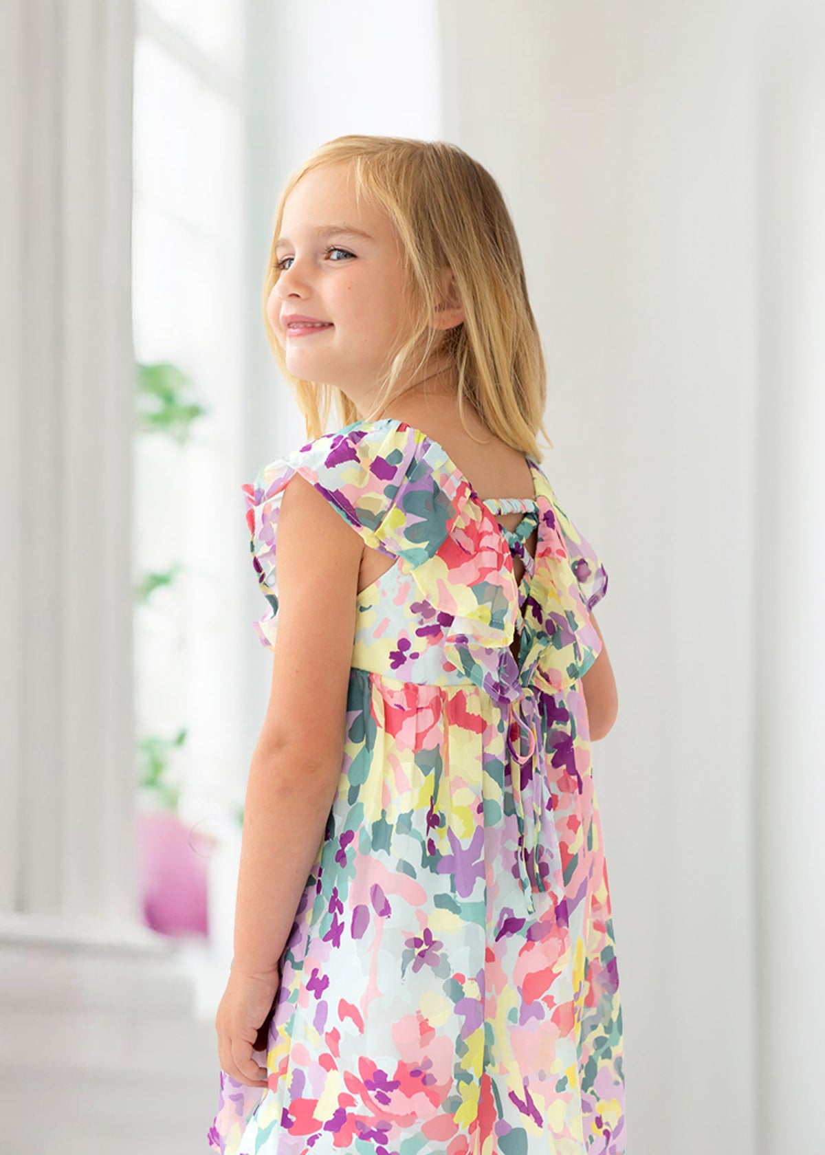 This dress features a colorful floral print in shades of pink, purple, yellow, and green on chiffon fabric. Designed with ruffled flutter sleeves, V-neck back detail, and a gathered waist for a sweet look. it combines style and comfort. The elastic cross back detail provides a flexible fit, while the pastel hues add a playful and fresh touch.