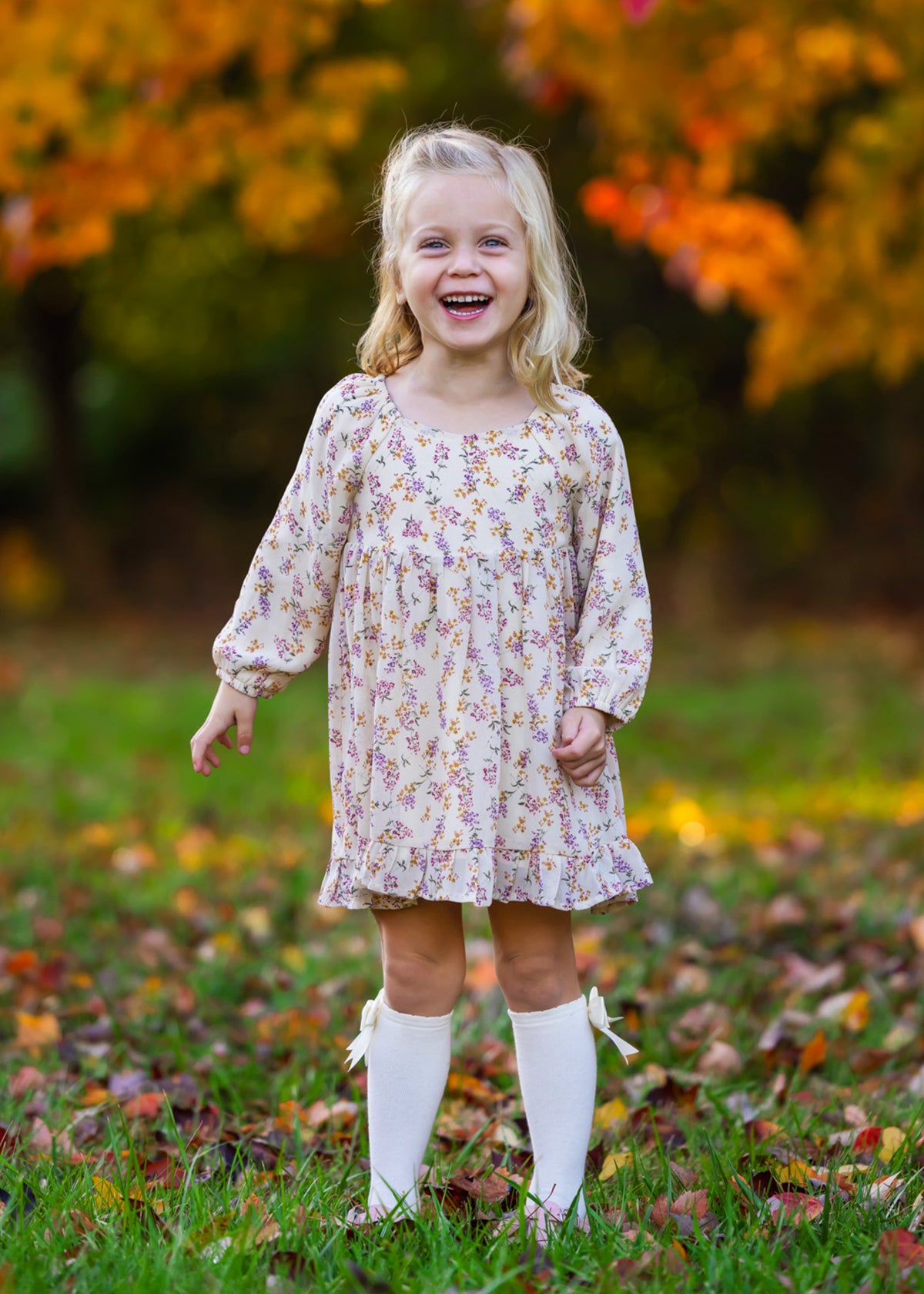 Dress your little one in timeless elegance with this lovely long-sleeve dress, perfect for any occasion. Made from soft, breathable cotton, this dress features a charming cream base beautifully accented with a delicate floral print in shades of pink, lavender, and gold. The flowy silhouette is enhanced with subtle gathering at the waist, offering a comfortable fit with a touch of flair.