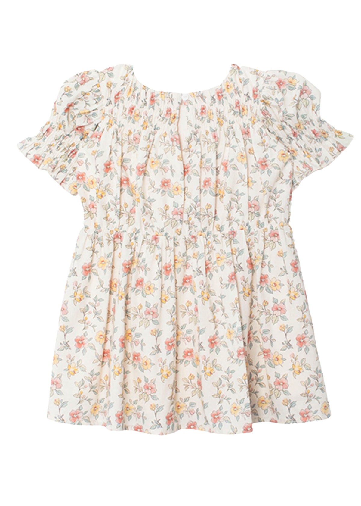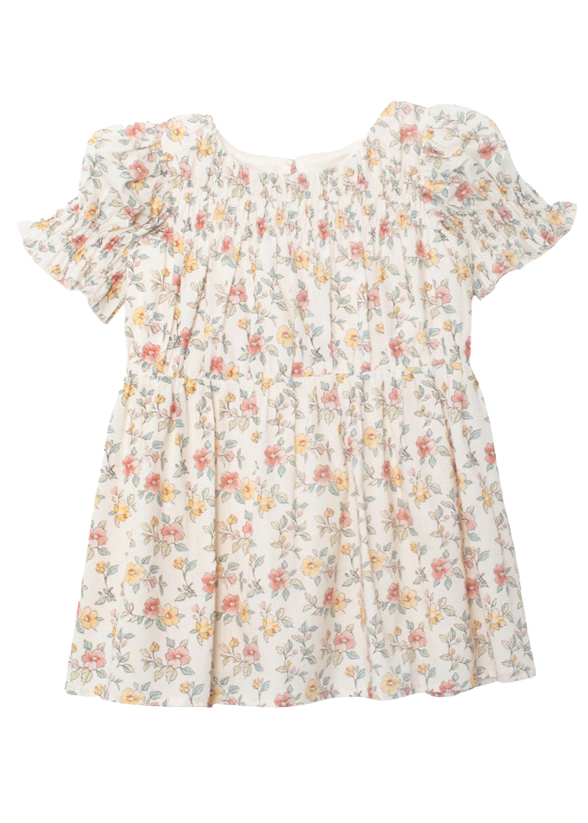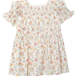This light dress features a pastel pattern with small multicolored designs in pink, yellow, and green. It has short puffed sleeves, a gathered bodice, and a flowing A-line skirt, offering a comfortable and stylish fit for everyday wear.