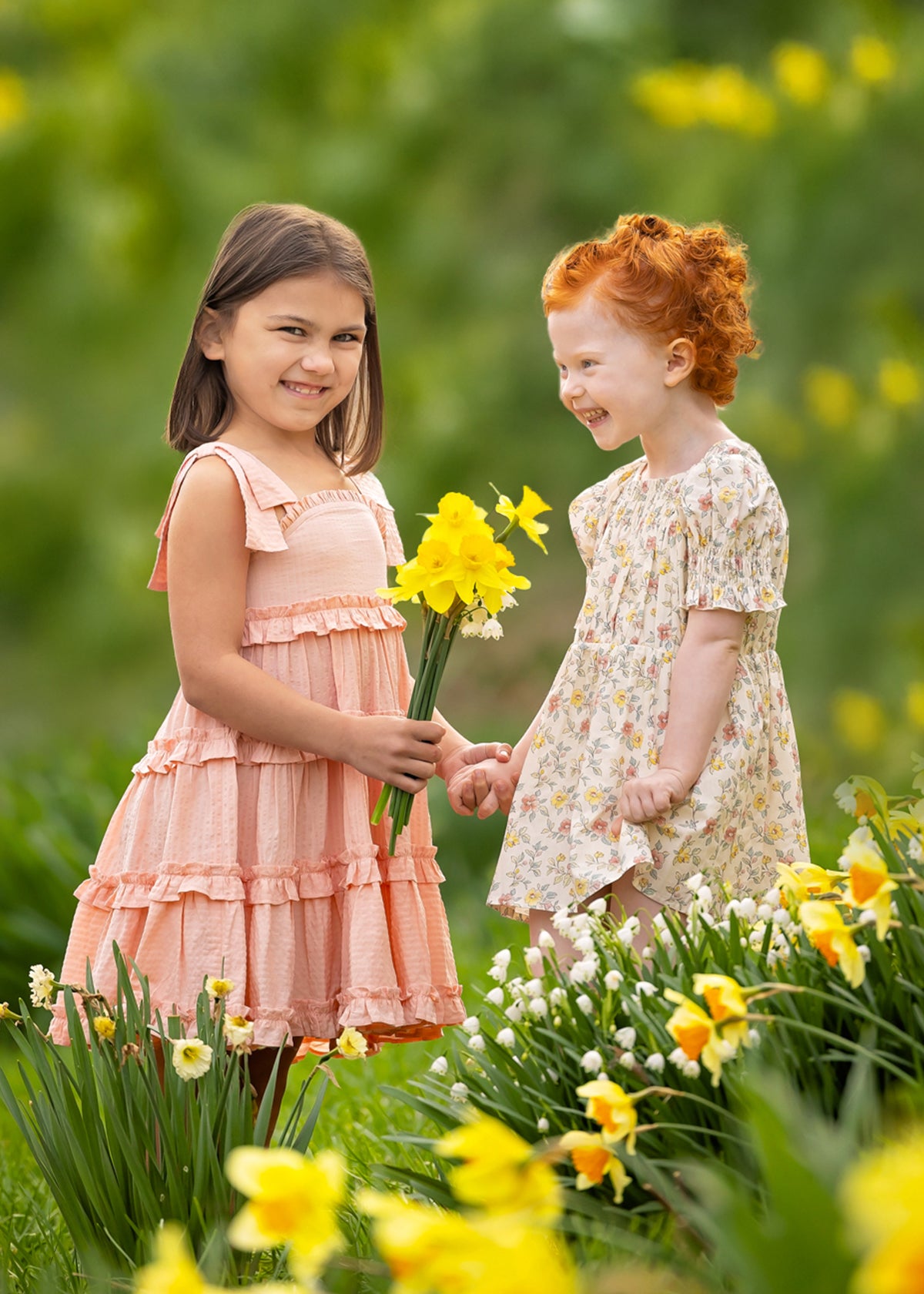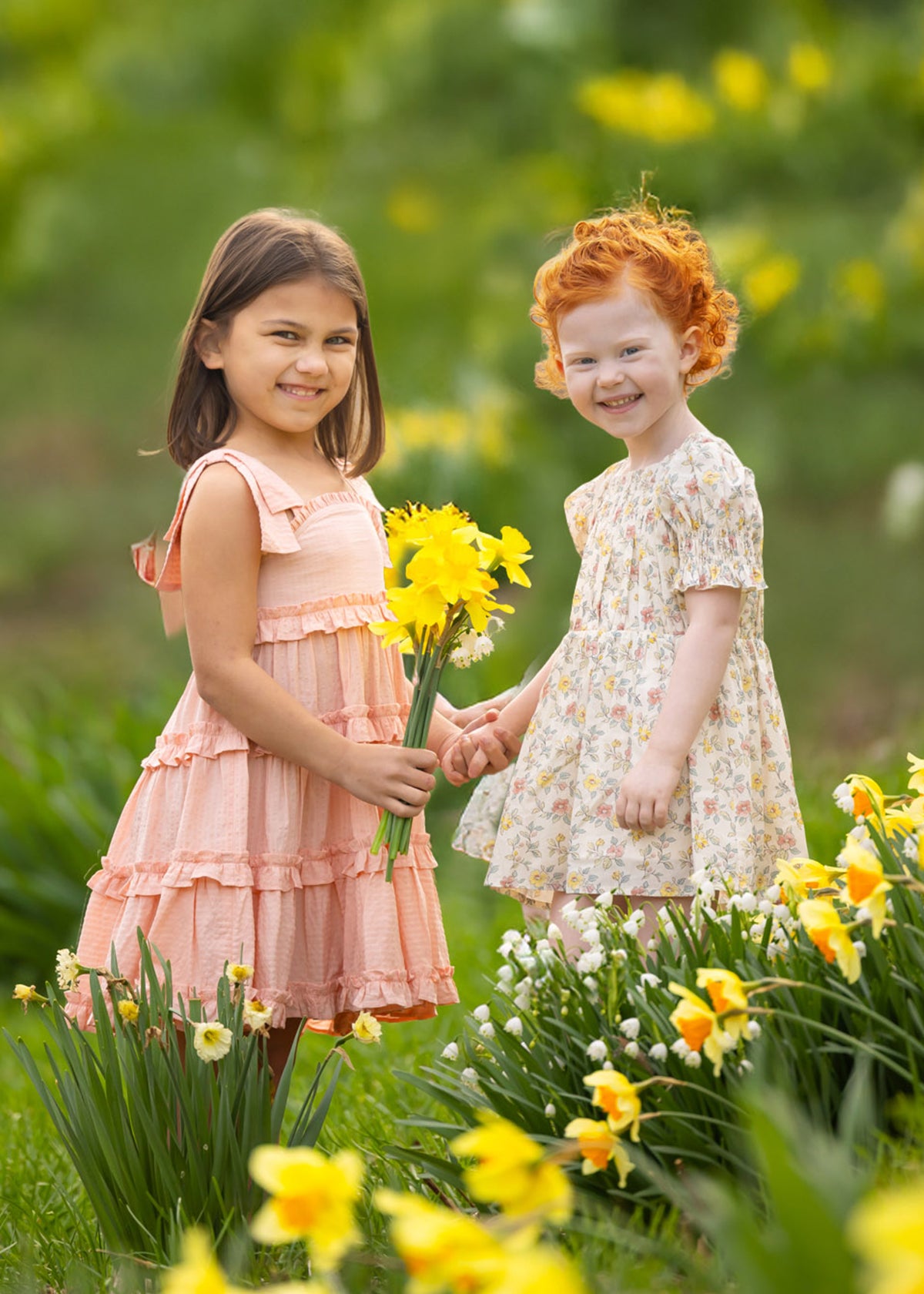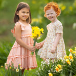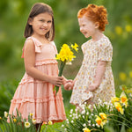 A young child with curly red hair smiles outdoors among yellow and white flowers, wearing the Audrey Flutter Sleeve Dress by Mabel and Honey. The blurred green background hints at a sunny spring or summer day.