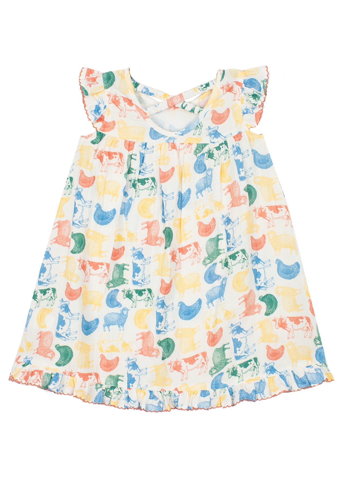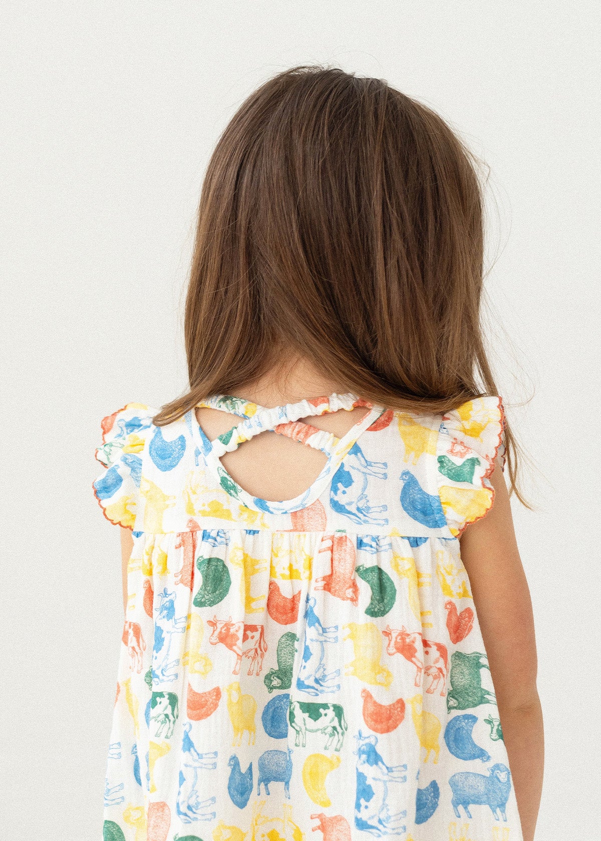 This girl's dress features a playful multicolor farm-inspired print. Designed with flutter sleeves, delicate ruffle trim along the hem, and a relaxed A-line silhouette, it?s lightweight, breathable, and perfect for sunny days.