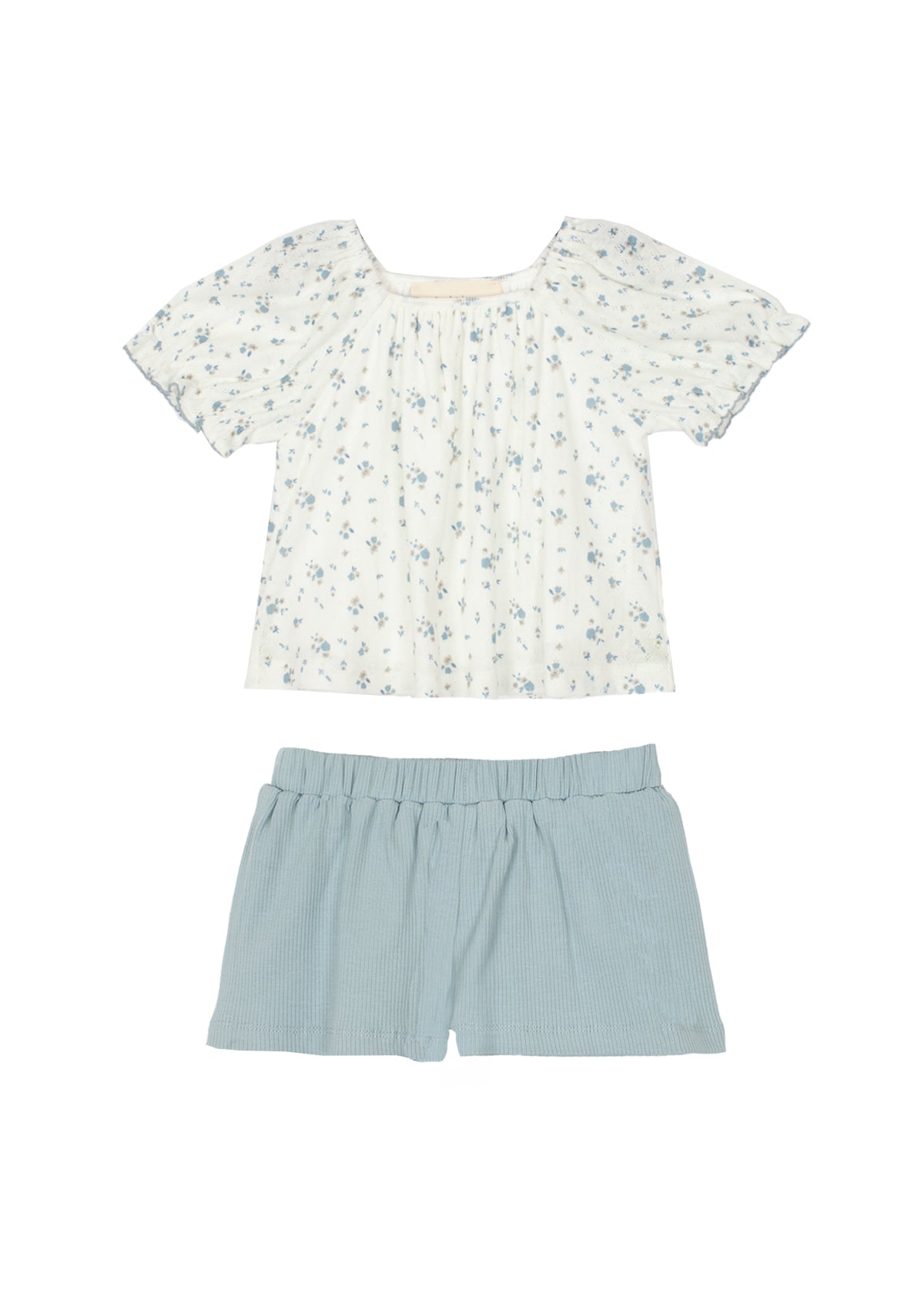 This adorable 2PC set for girls features a sweet and delicate soft blue flower pattern. The top has a puff sleeve square neck line, paired with light blue knit shorts.