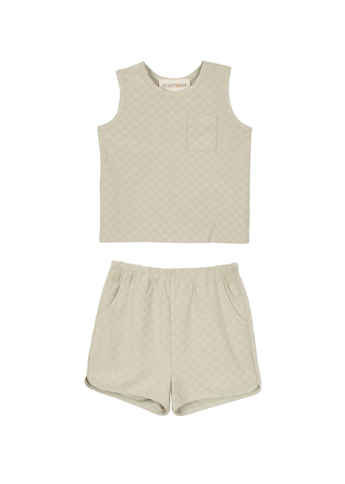 This boys' two-piece set in a muted sage tone features a sleeveless top with a subtle textured pattern and a small chest pocket for added detail. The coordinating shorts offer a relaxed fit with an elastic waistband and side pockets, making this breathable and lightweight outfit perfect for everyday wear.