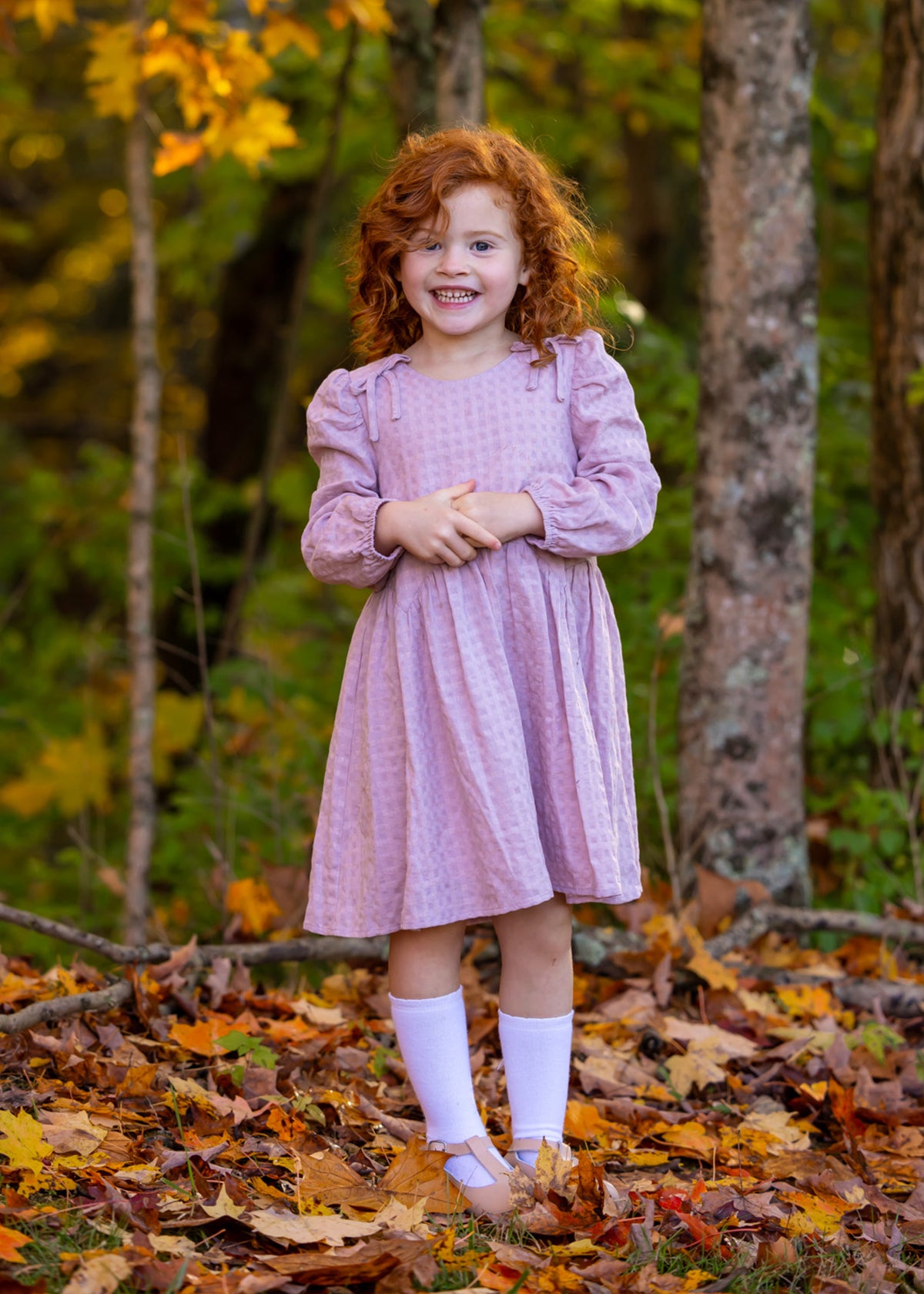 The "Check Me Out" girl's dress is crafted from a soft, breathable fabric in a delicate mauve gingham pattern. This dress features long sleeves with elasticized cuffs and charming bow details at the shoulders, adding a touch of elegance. The gathered waist enhances the silhouette, making it an ideal choice for both casual and special occasions.