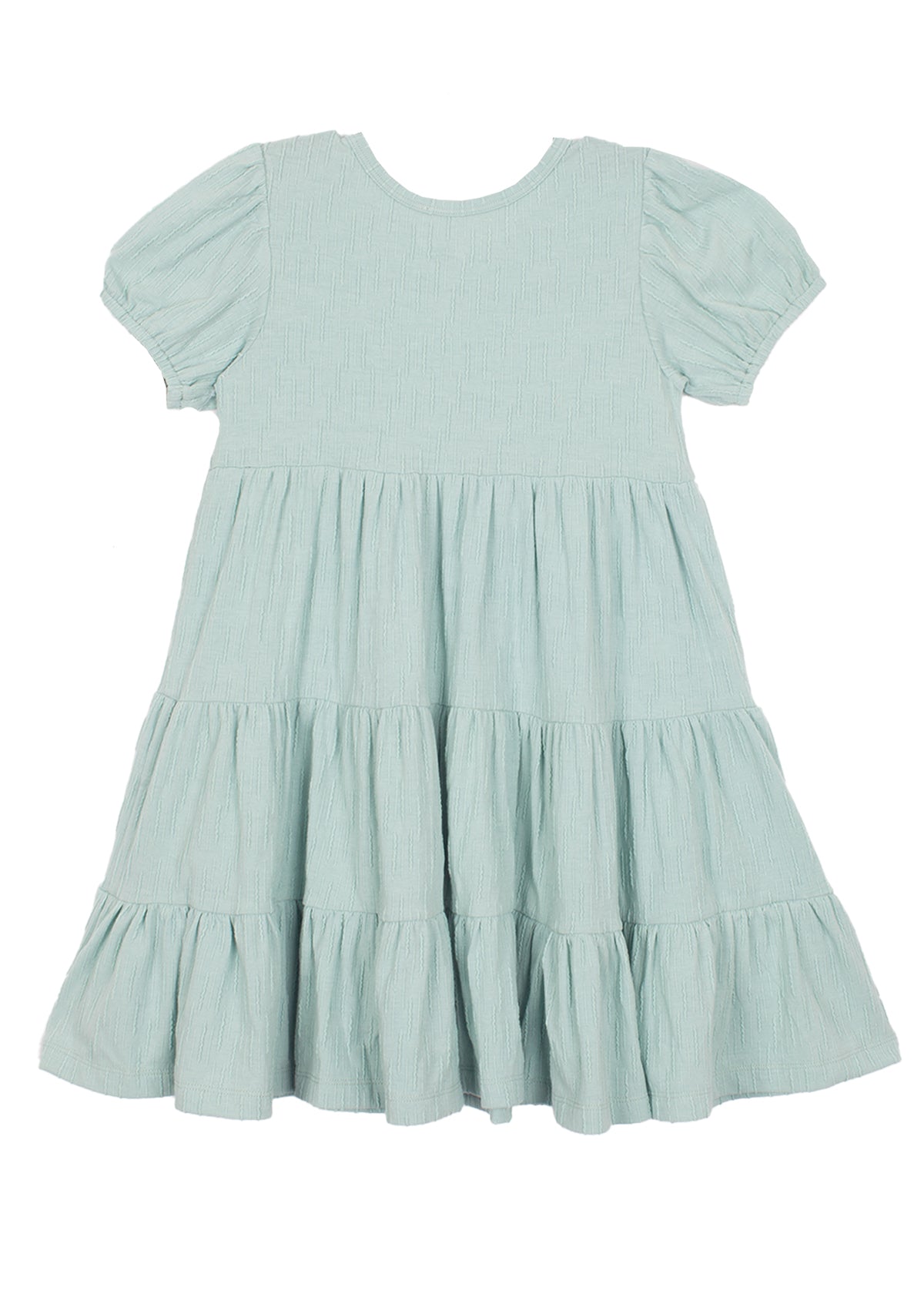 This girls' dress in soft sage green features a delicate textured pattern and a flowy tiered skirt for graceful movement. Designed with puff sleeves and a V-neckline, it blends elegance with everyday comfort. The lightweight fabric ensures breathability, making it a perfect choice for special occasions or casual outings.