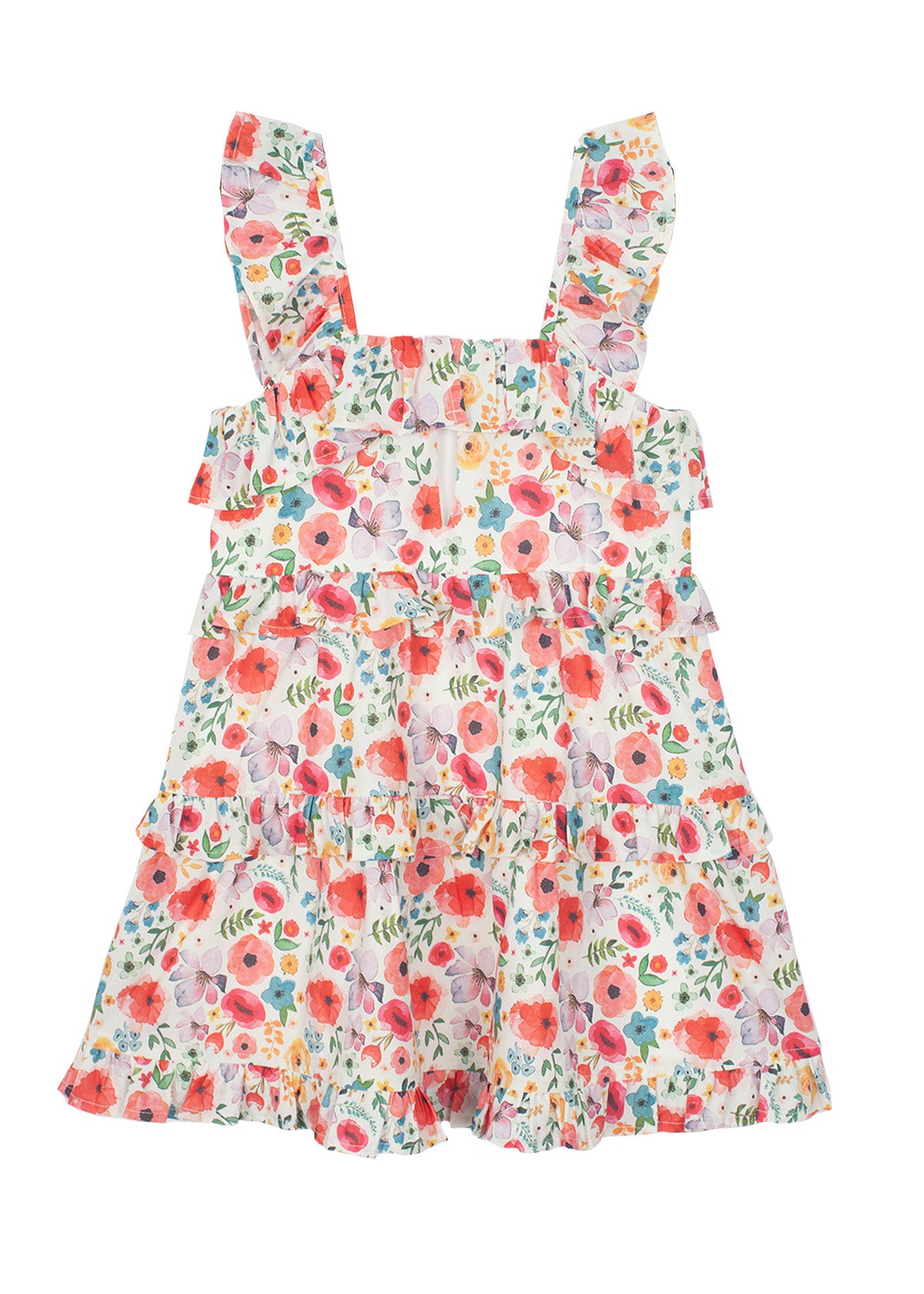 This girl's dress features features a colorful floral print in shades of pink, red, purple, and green on a lightweight chiffon fabric. Designed with ruffled shoulder straps, tiered ruffle layers for added volume, and a flowy silhouette, its perfect for twirl-worthy moments.