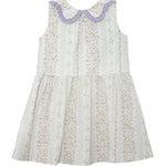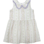 Elevate your everyday style with this sleeveless woven dress, showcasing soft pink and green floral prints. A delicate lavender ruffled collar and a gathered skirt add playful charm to its timeless silhouette, making it a perfect blend of comfort and elegance.