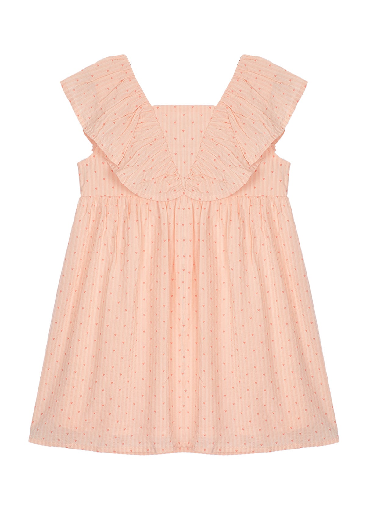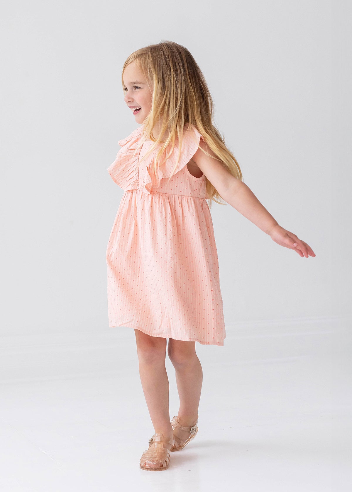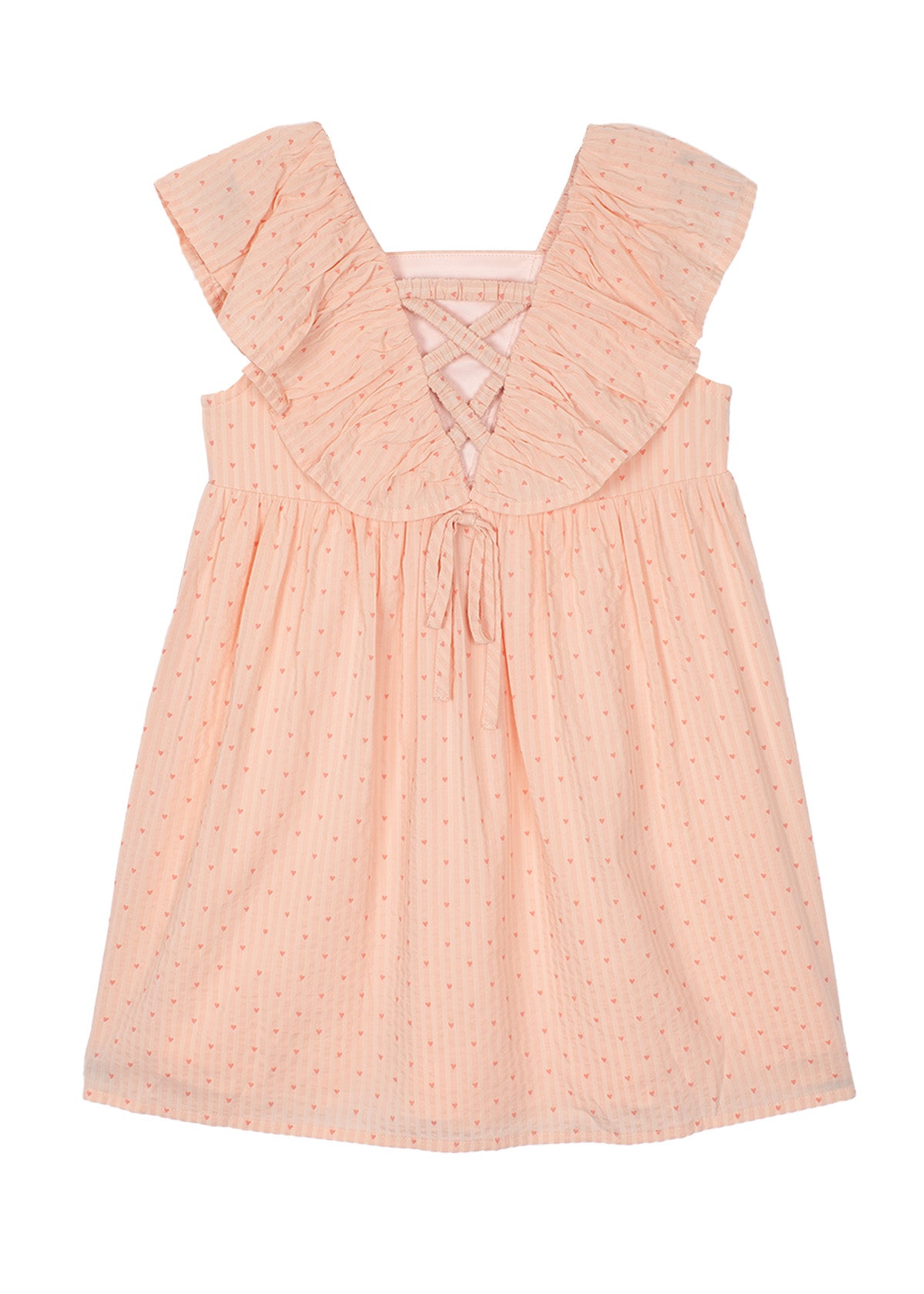 This blush pink girls' dress features a delicate heart pattern and a breezy A-line silhouette. The ruffled V-back detail adds a touch of elegance, while the sleeveless design keeps it perfect for warm days. Lightweight and comfortable, it's an ideal choice for special occasions or everyday wear with effortless style.