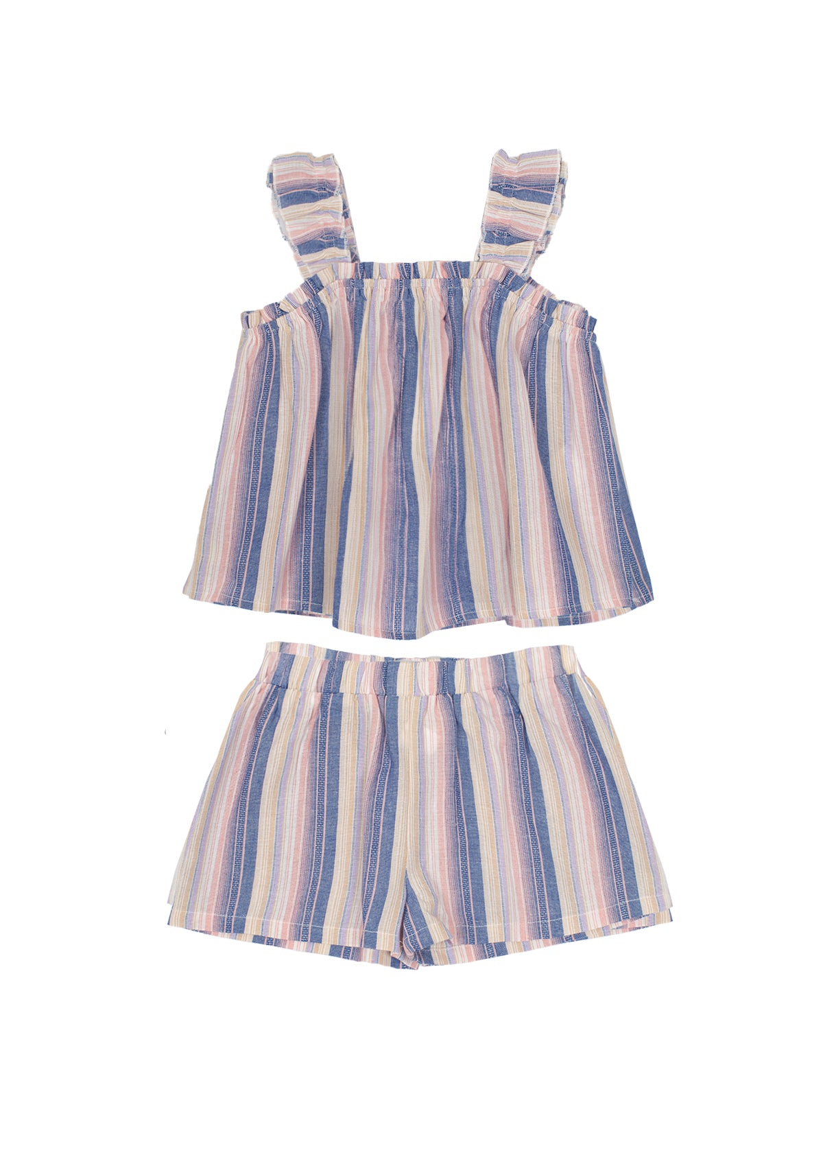 This girl's 2-piece set includes a breezy sleeveless top and matching shorts in a multicolor striped design featuring soft hues of blue, pink, and cream. The top boasts delicate ruffle details on the straps, while the relaxed shorts have an elastic waistband for comfort and easy movement, perfect for warm days.