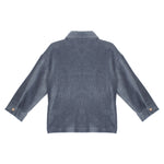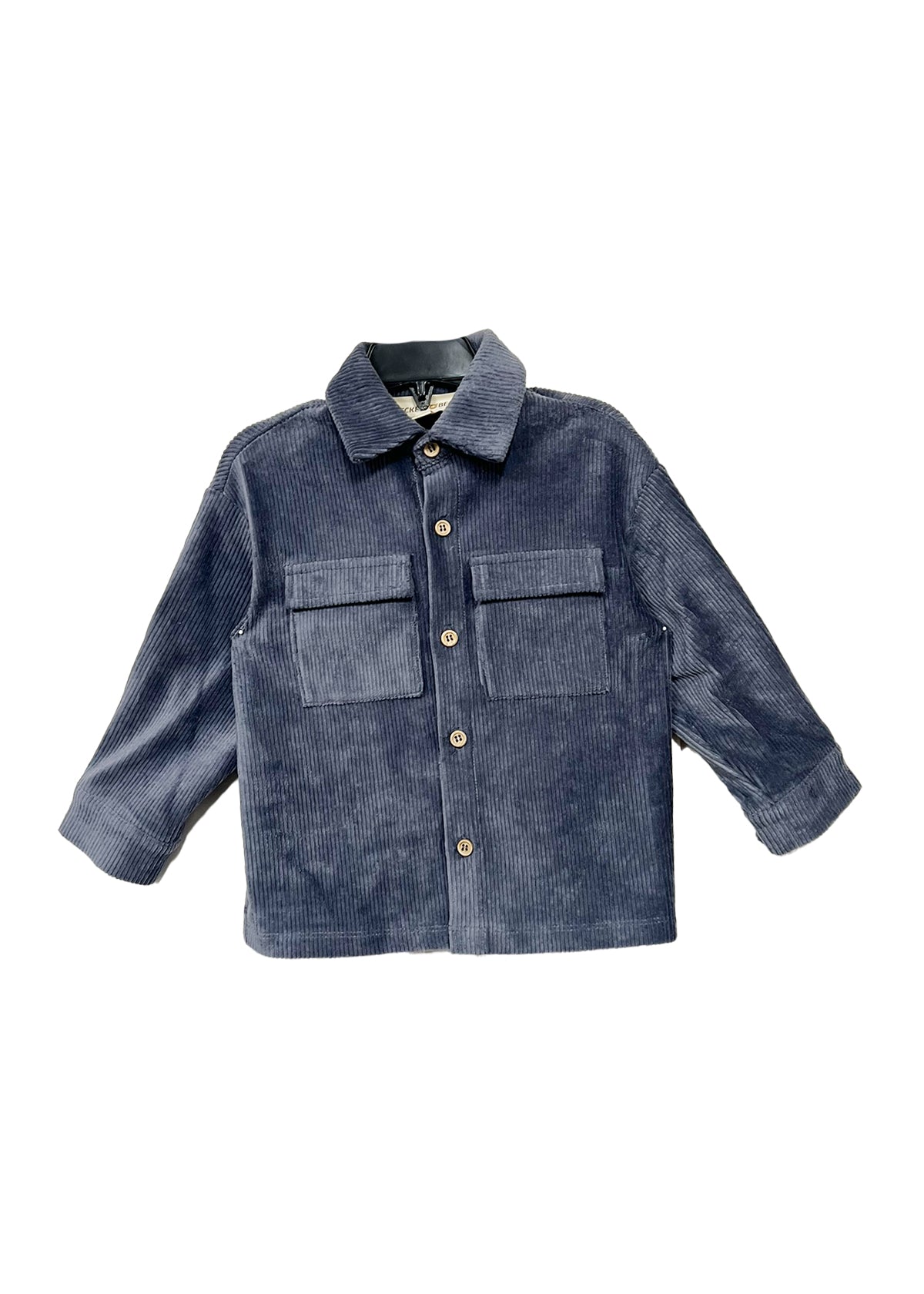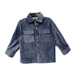 This stylish boys' top features a warm, soft corduroy fabric in a sophisticated slate blue color. The shirt is designed with a classic button-down front and dual chest pockets for a touch of utility and charm. Its long sleeves and relaxed fit make it perfect for layering on cool days.